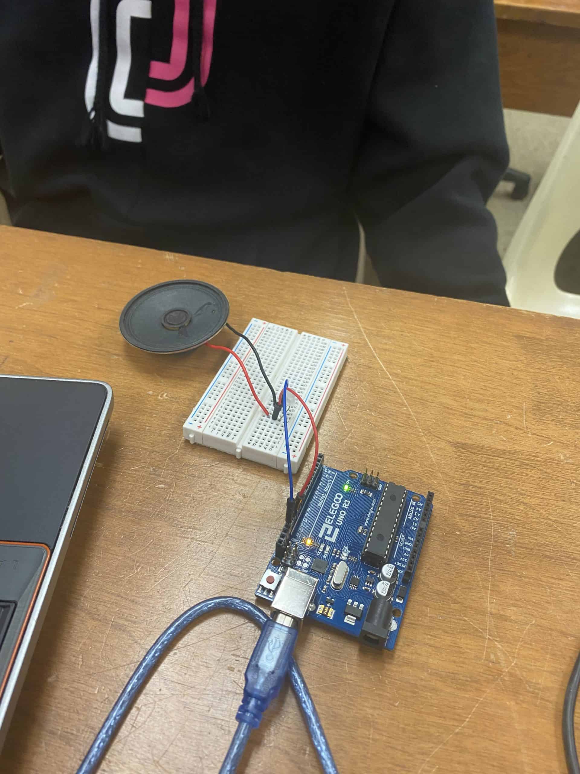 Draydon Wood, a robotics 1 student, shared how Arduino can be used to create music by generating sound through external audio components like speakers. Arduino boards have a built-in library called a “Tone” library. This library allows you to generate simple musical tones by sending specific frequency signals to a digital pin. He shared that “by varying the frequency and duration of these tones through coding, you can produce different melodies.” Recognizable melodies such as the Mario Brothers and Star Wars theme songs.