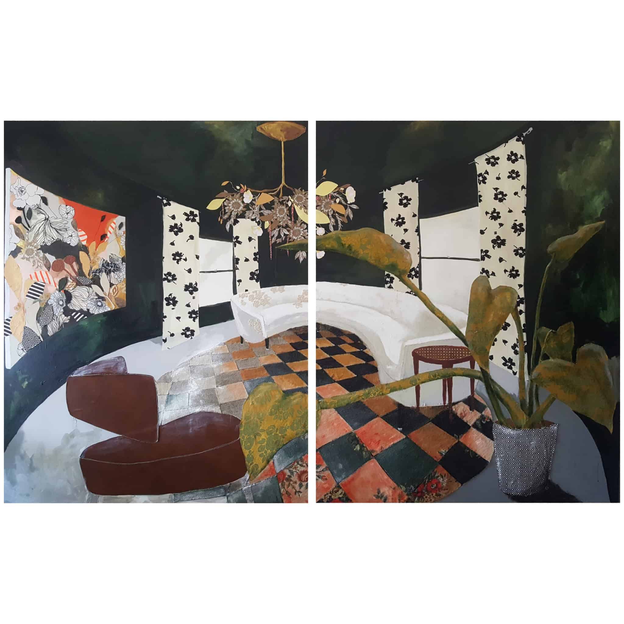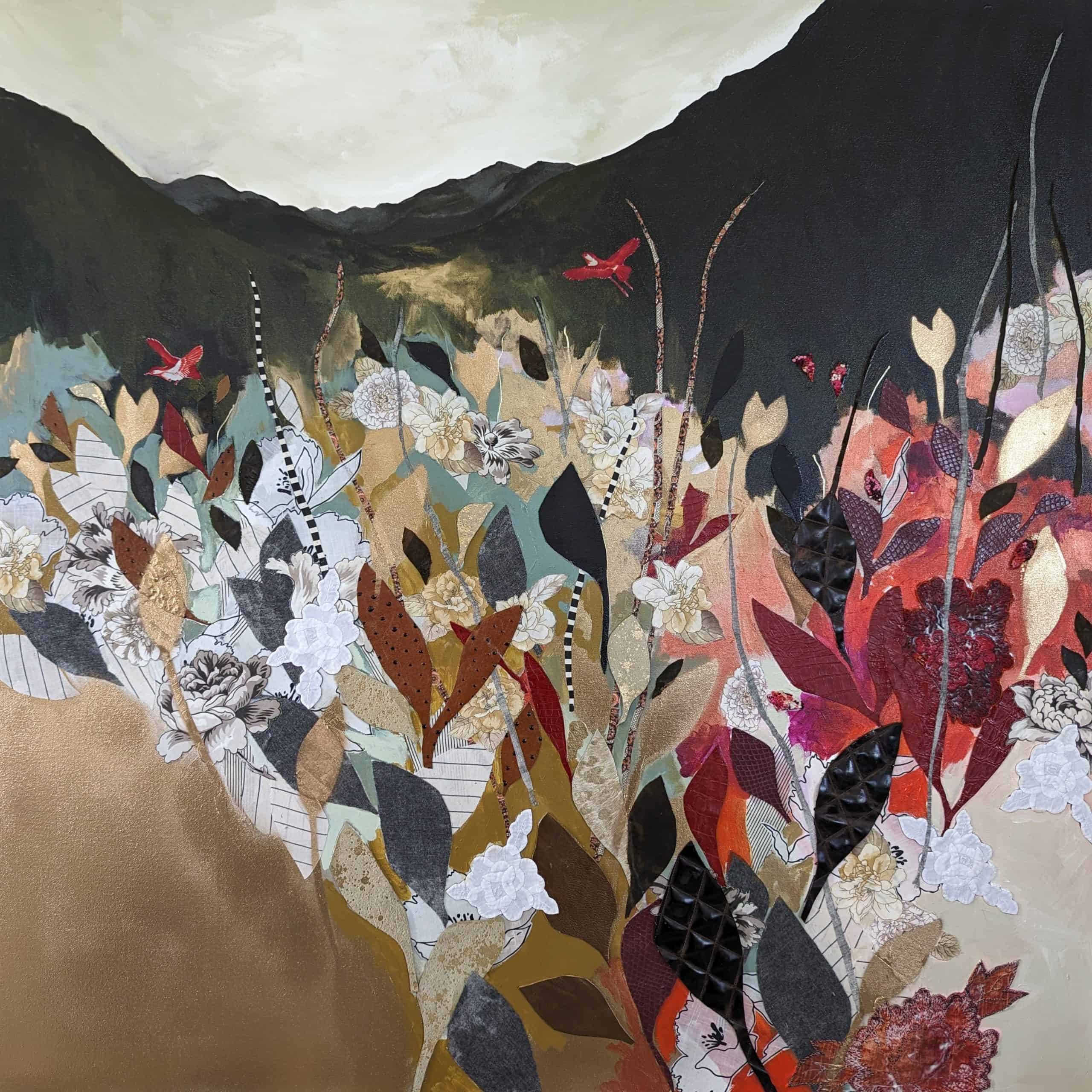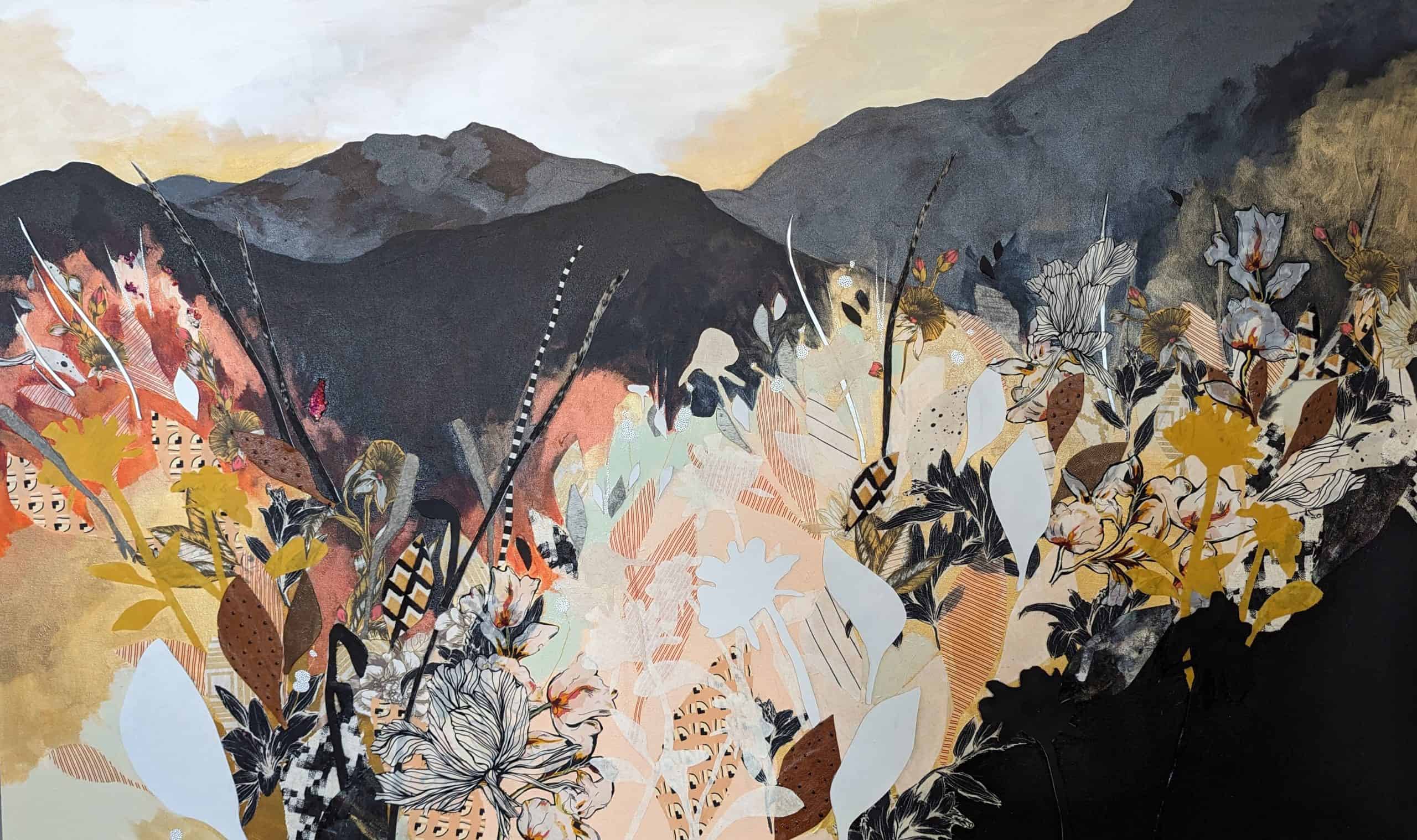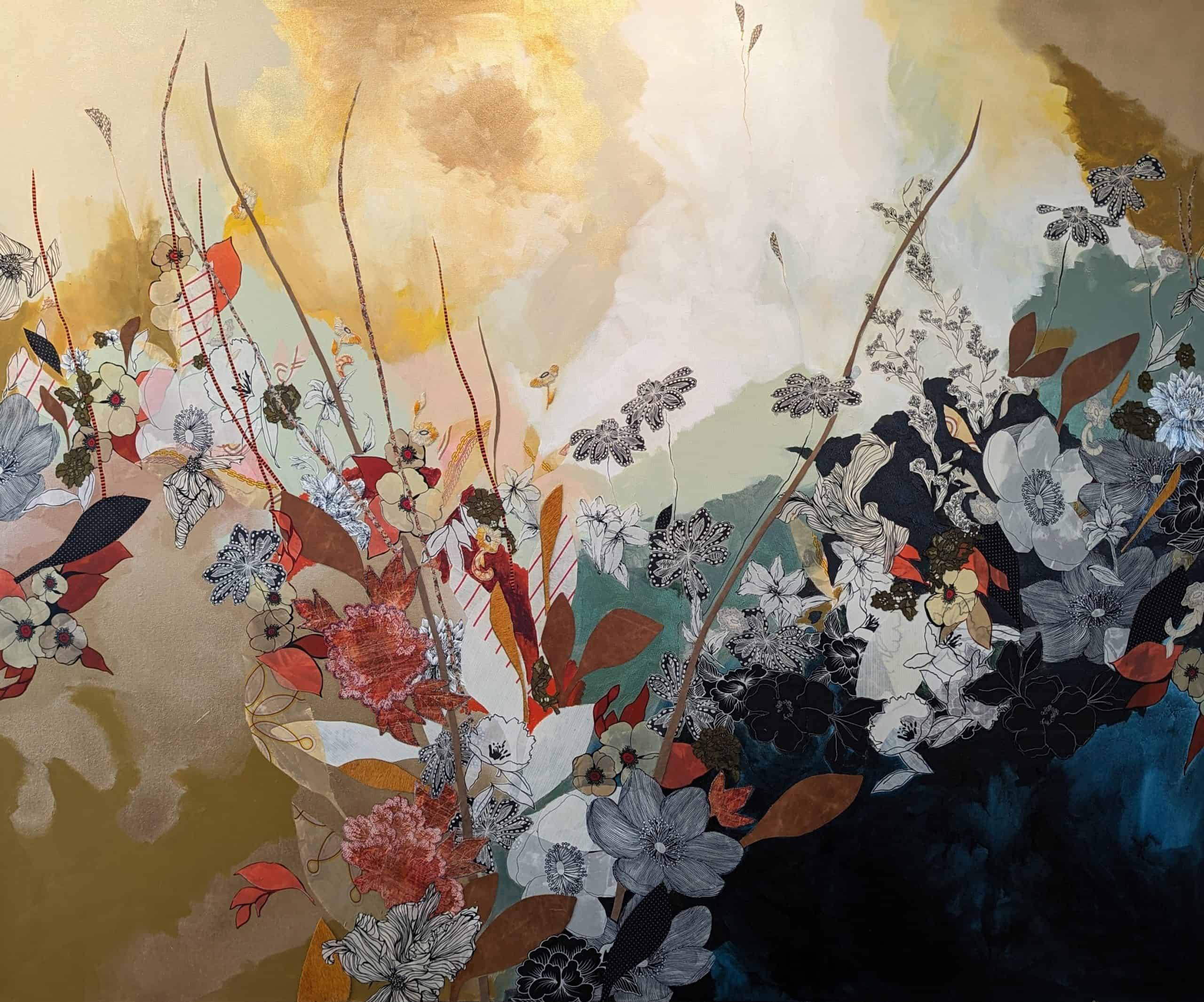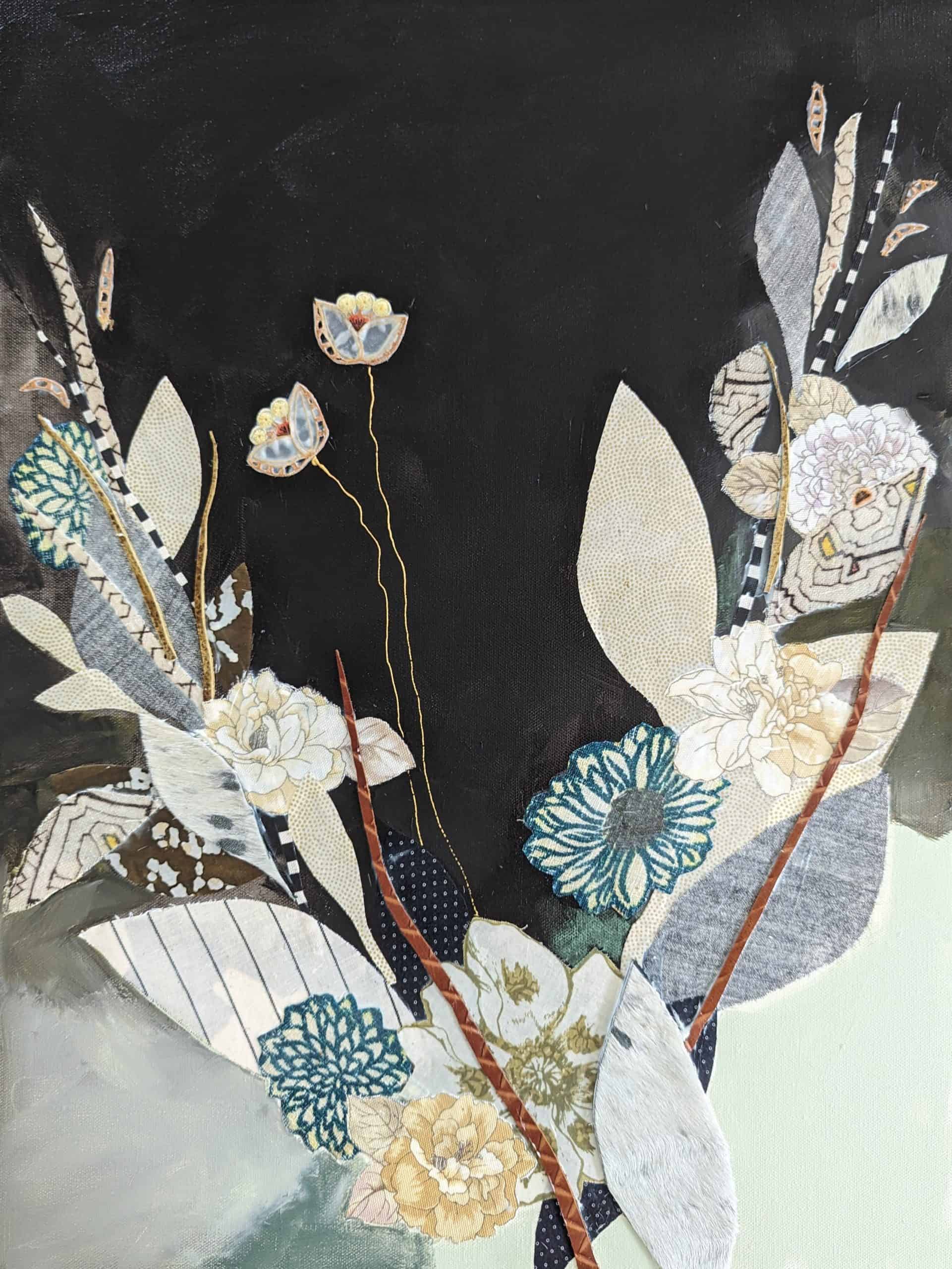 But Miller and her art have stretched beyond the simple label of The Chair Lady. For one, her subject has shifted. Her mixed media work, which often includes bits of fabric, quilts, or other found materials, now features floral images, while maintaining the layering and abstractness of her style. Secondly, Miller’s work has garnered significant attention in the last decade. At festivals and art shows – Miller travels with her work 20 weekends each year, sometimes with her family – she has been named a finalist for the William and Dorothy Yeck Purchase Award in the Young Painters Competition at Miami University in 2016, Best in Show at the Virginia Museum of Contemporary Art Boardwalk Art Show in 2016 and 2023, and selected for a solo show at VaMOCA’s Runnymede Gallery in 2017. Her work has been published in the magazine Studio Visit, the periodical New American Paintings, and the book Wild Lands by Jen Tough Gallery. Her work has homes in many art collections, both private and corporate, including the Capital One Art Bank private collection.