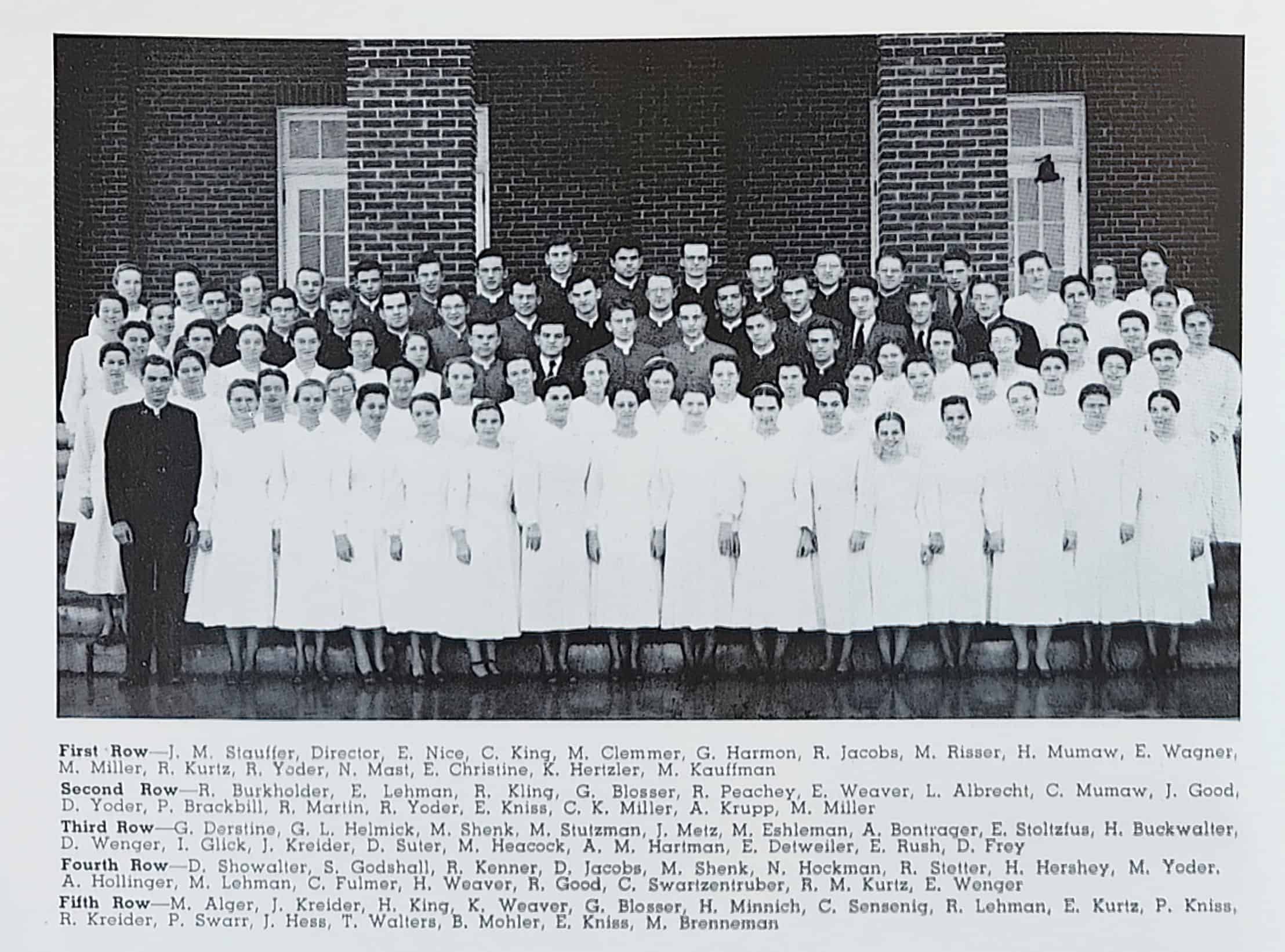 Shenk attended EMS for three years, gaining experiences that would last him a lifetime. Not one to skip daily chapel services like some of his classmates, he worked in the newly-built chapel, Lehman Auditorium, for 45 cents an hour (with a half-cent raise each year) on Saturdays. Or when farmers posted their phone numbers on the bulletin board in need of weekend help, he and his friends cleaned chicken houses. More for leisure than work, Shenk traveled in a 1937 four-door Dodge all the way to Knoxville, Tennessee as part of an a cappella quartet.