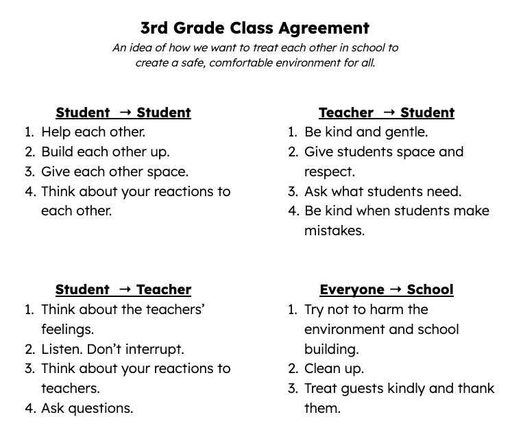 The 3rd Grade Class Agreement that they came up with (and that changes every year) includes actions like helping each other, building each other up, and being mindful of reactions towards peers and teachers. It emphasizes mutual respect and kindness, laying the groundwork for a positive school experience and is the baseline for the students and teacher who practice and experience peacemaking.