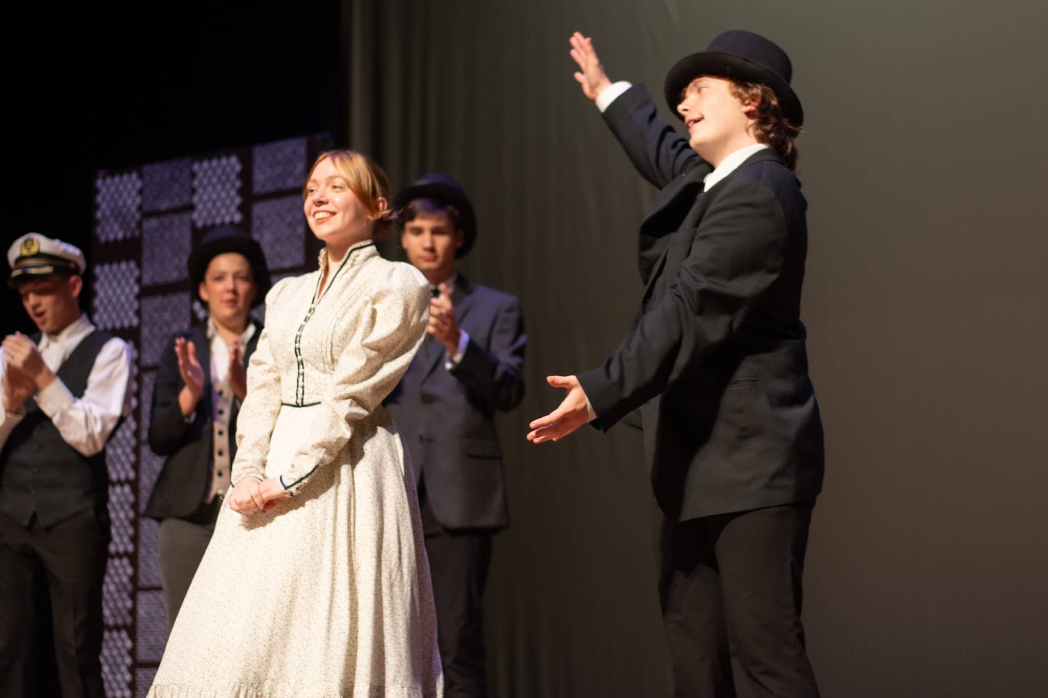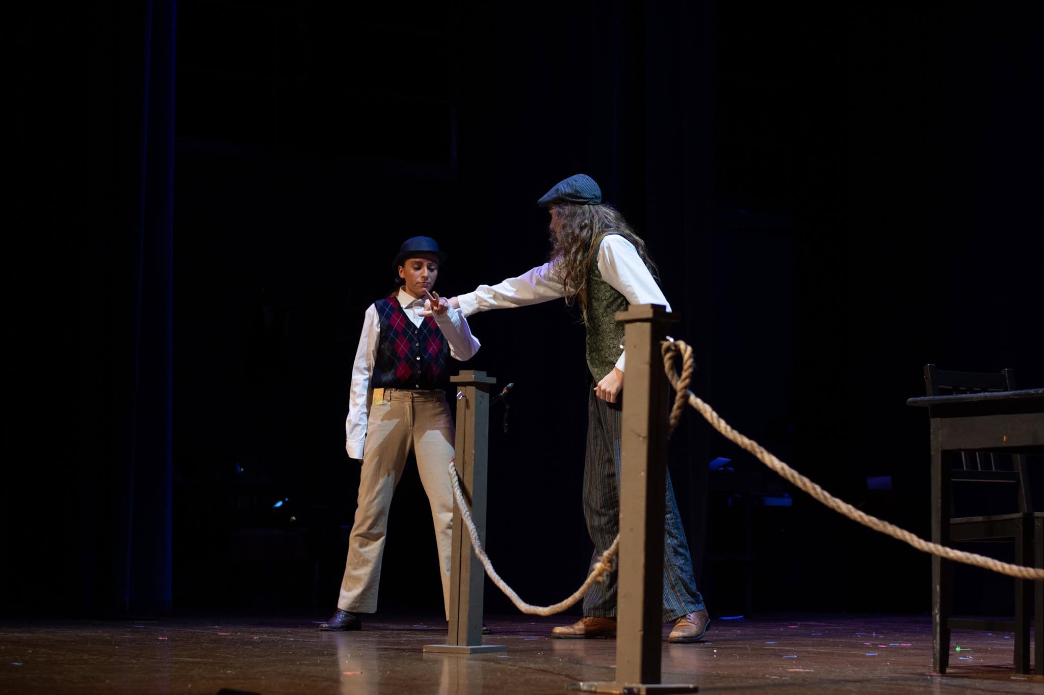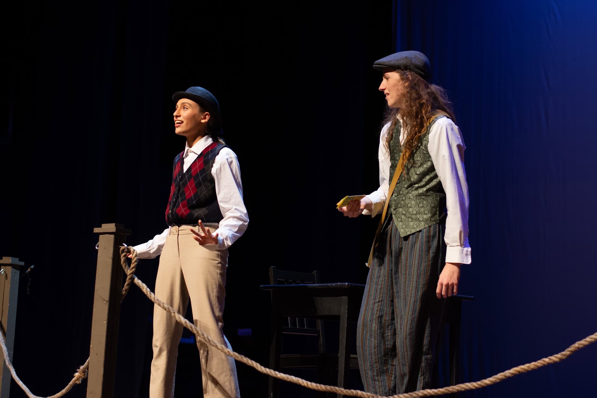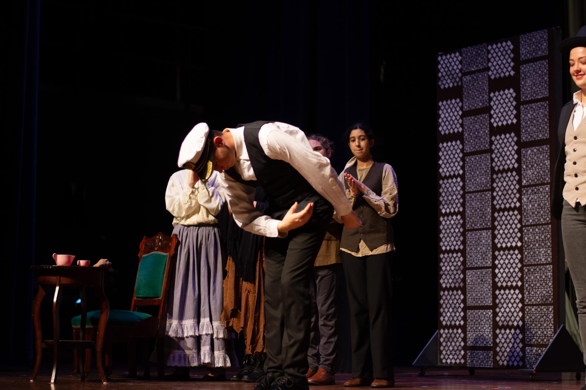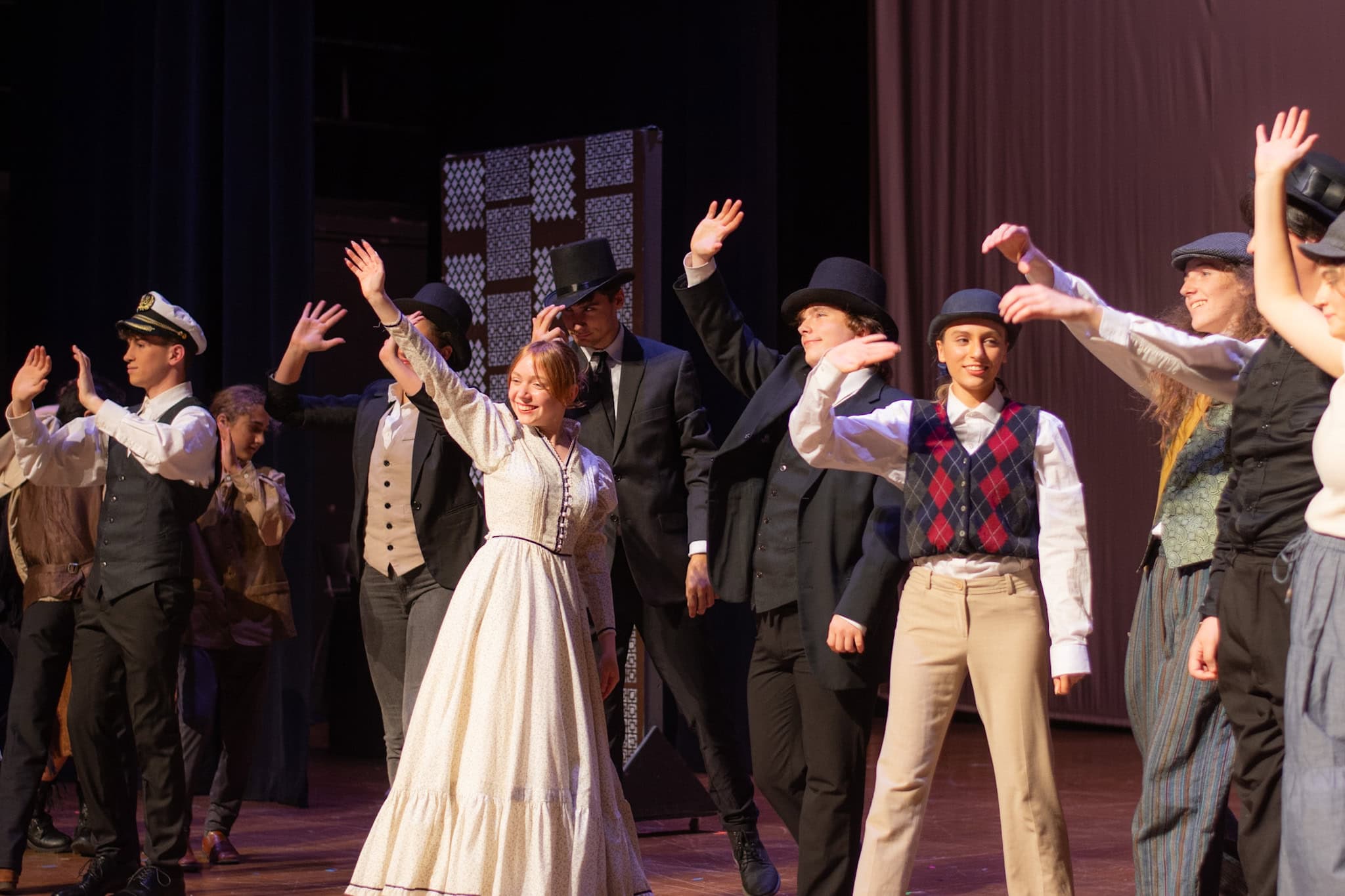 The plot follows Phileas Fogg ( Jackson Comfort ’26) on his whirlwind journey around the globe, utilizing various modes of transport—by train, elephant, and ship. A standout moment in the production was the students’ portrayal of being aboard a ship, rhythmically swaying in perfect harmony as they mimicked the ocean’s waves, accompanied by a lively sea tune played also by our students. The production also featured impressive sound and lighting effects, skillfully managed by Samuel Aponte ’28, enhancing the overall experience.