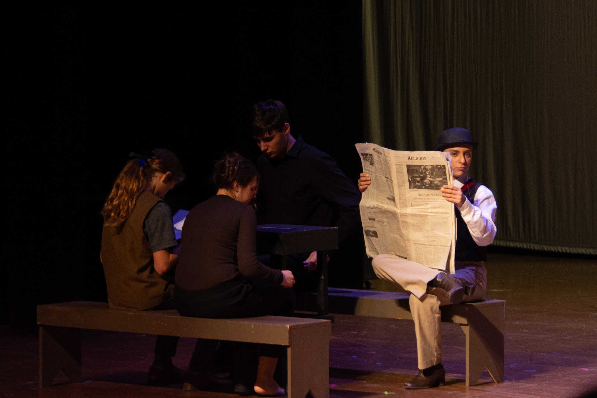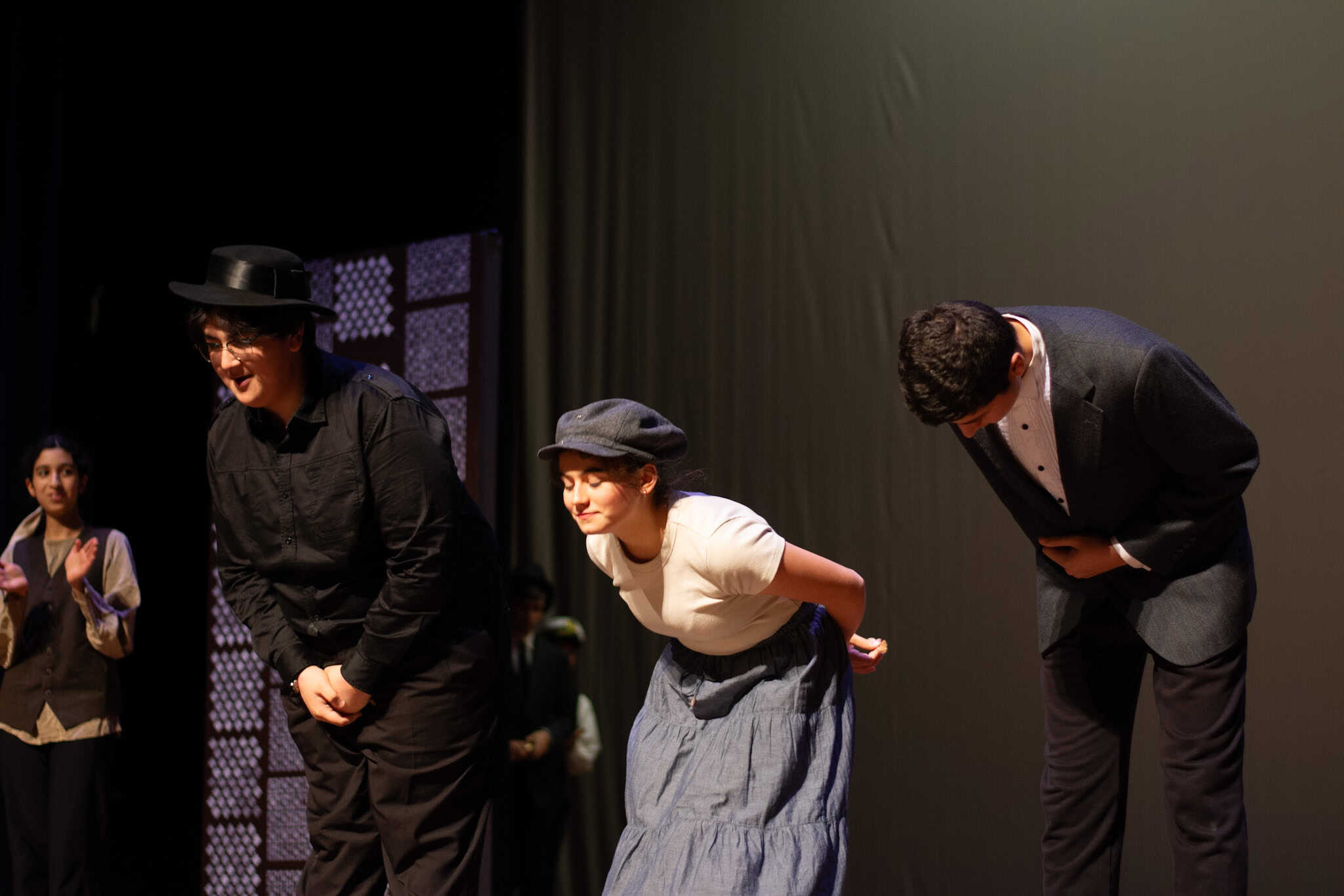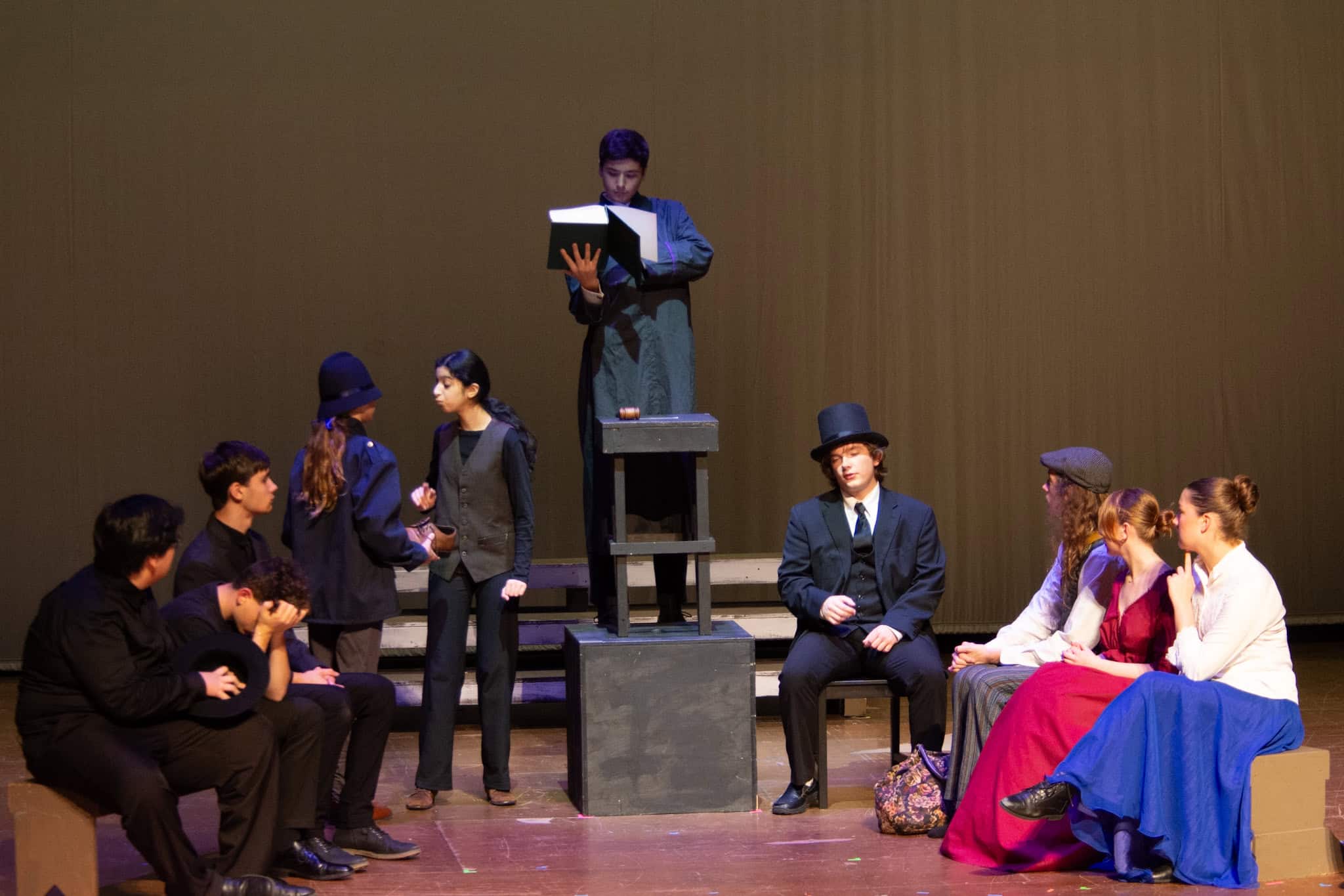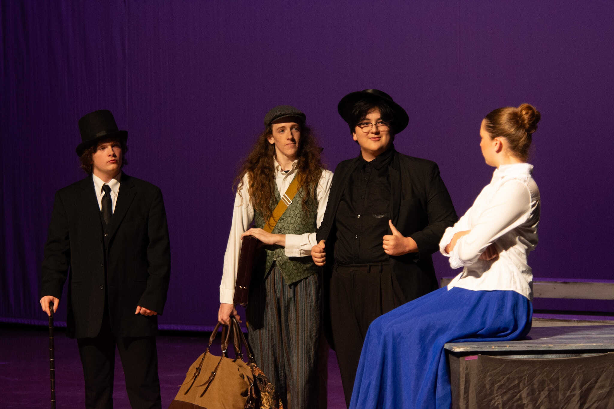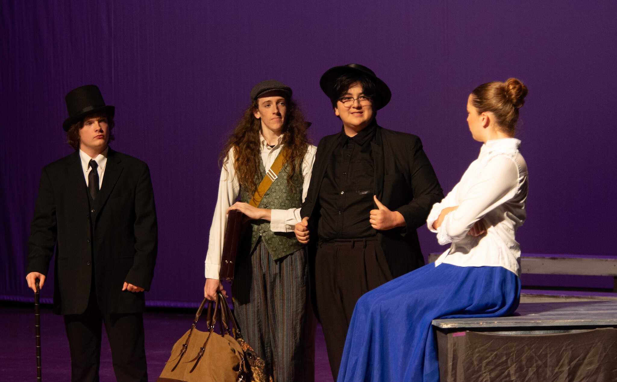 The plot follows Phileas Fogg ( Jackson Comfort ’26) on his whirlwind journey around the globe, utilizing various modes of transport—by train, elephant, and ship. A standout moment in the production was the students’ portrayal of being aboard a ship, rhythmically swaying in perfect harmony as they mimicked the ocean’s waves, accompanied by a lively sea tune played also by our students. The production also featured impressive sound and lighting effects, skillfully managed by Samuel Aponte ’28, enhancing the overall experience.