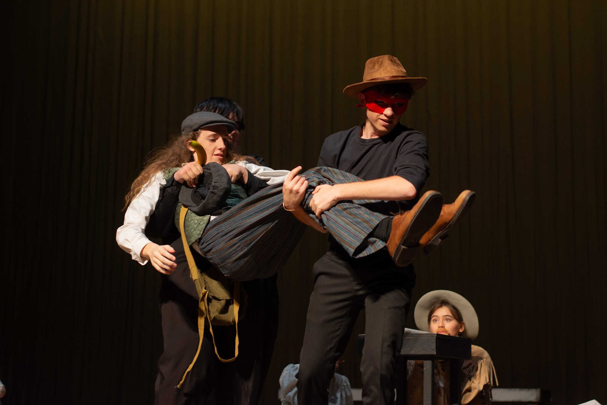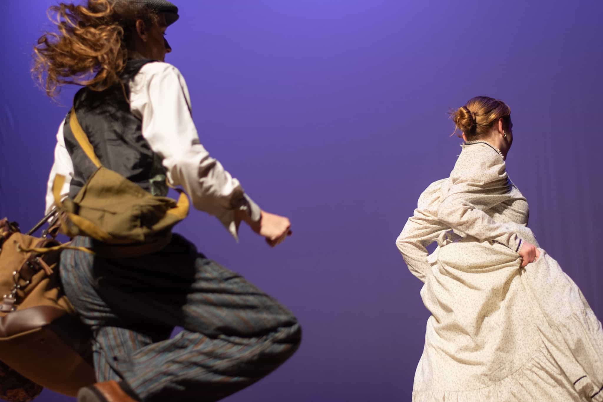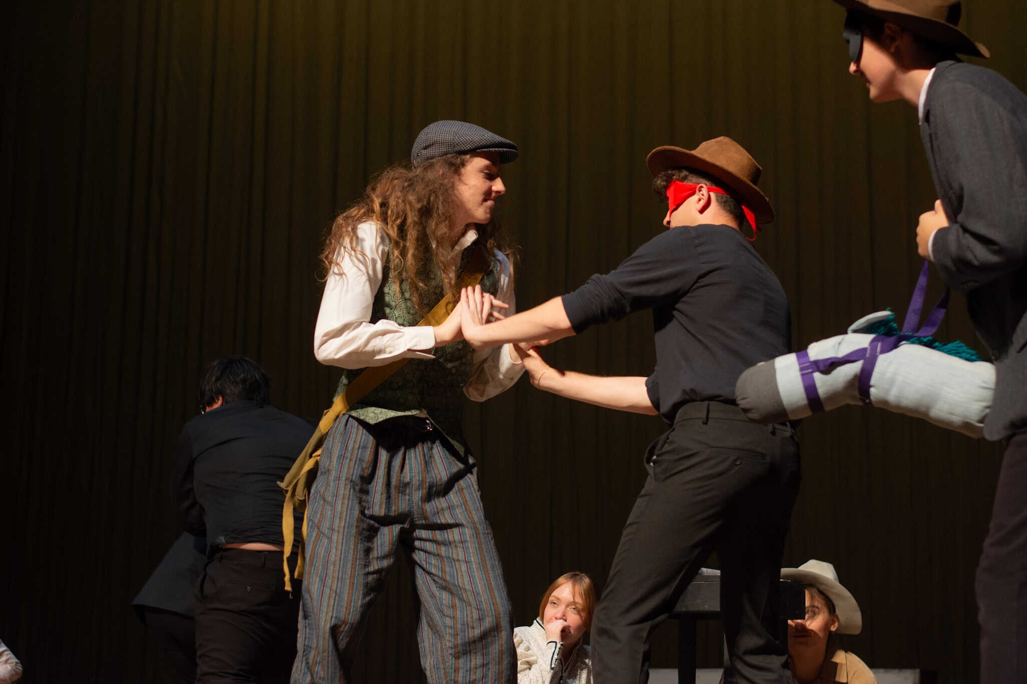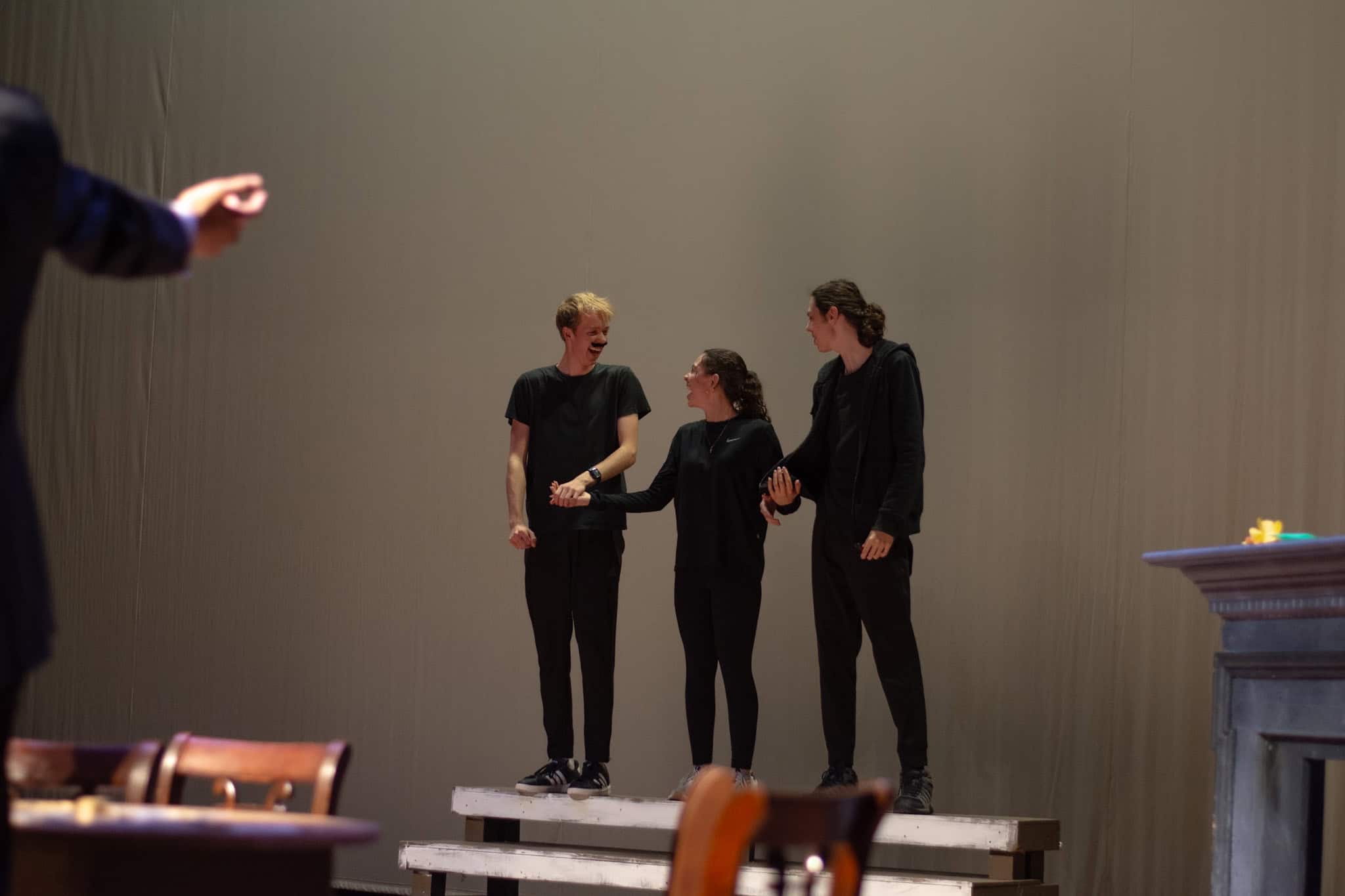 “One favorite moment was blocking the bandit scene in act two when Passepartout gets kidnapped. It’s such an absurd moment. There’s a fake horse, masks, cowboy hats, and the bandits names are John, Johnson, Son, and I believe Johnsonson. To make sure we had it and nobody would accidentally got elbowed, we ran it in slow motion with everyone hilariously falling to ground and exclaiming ‘Johnson!!!’ at a turtle’s pace. It’s been so fun working with the students and Liz to allow the students to find those moments of absurdity and fun choices whether we end up doing them in the show or not.” – Elizabeth Eby, co-director
