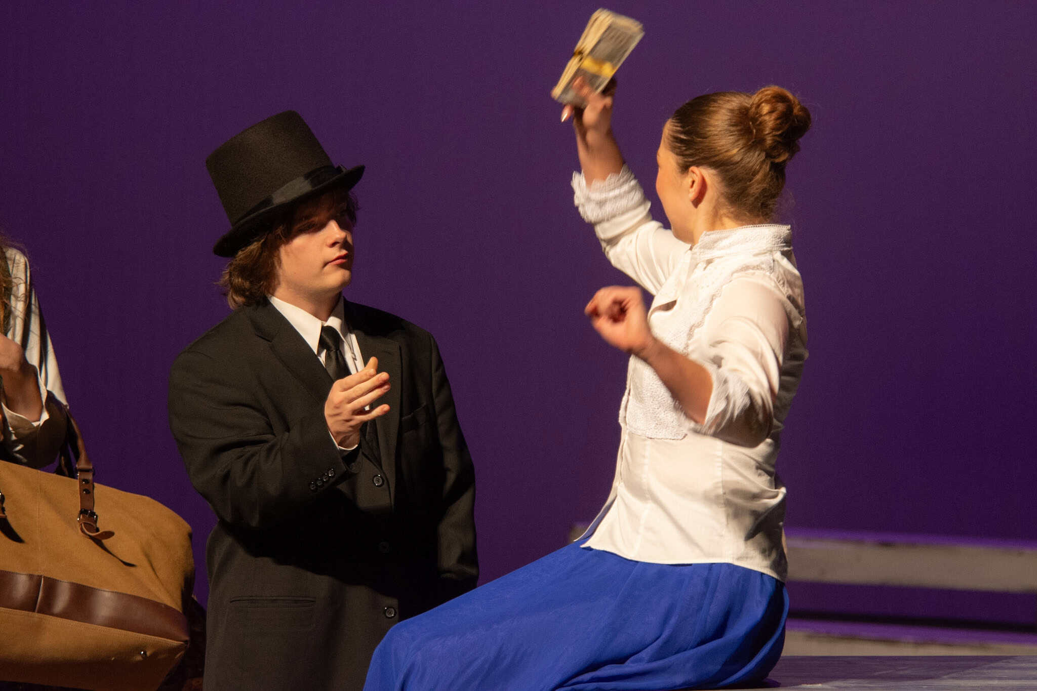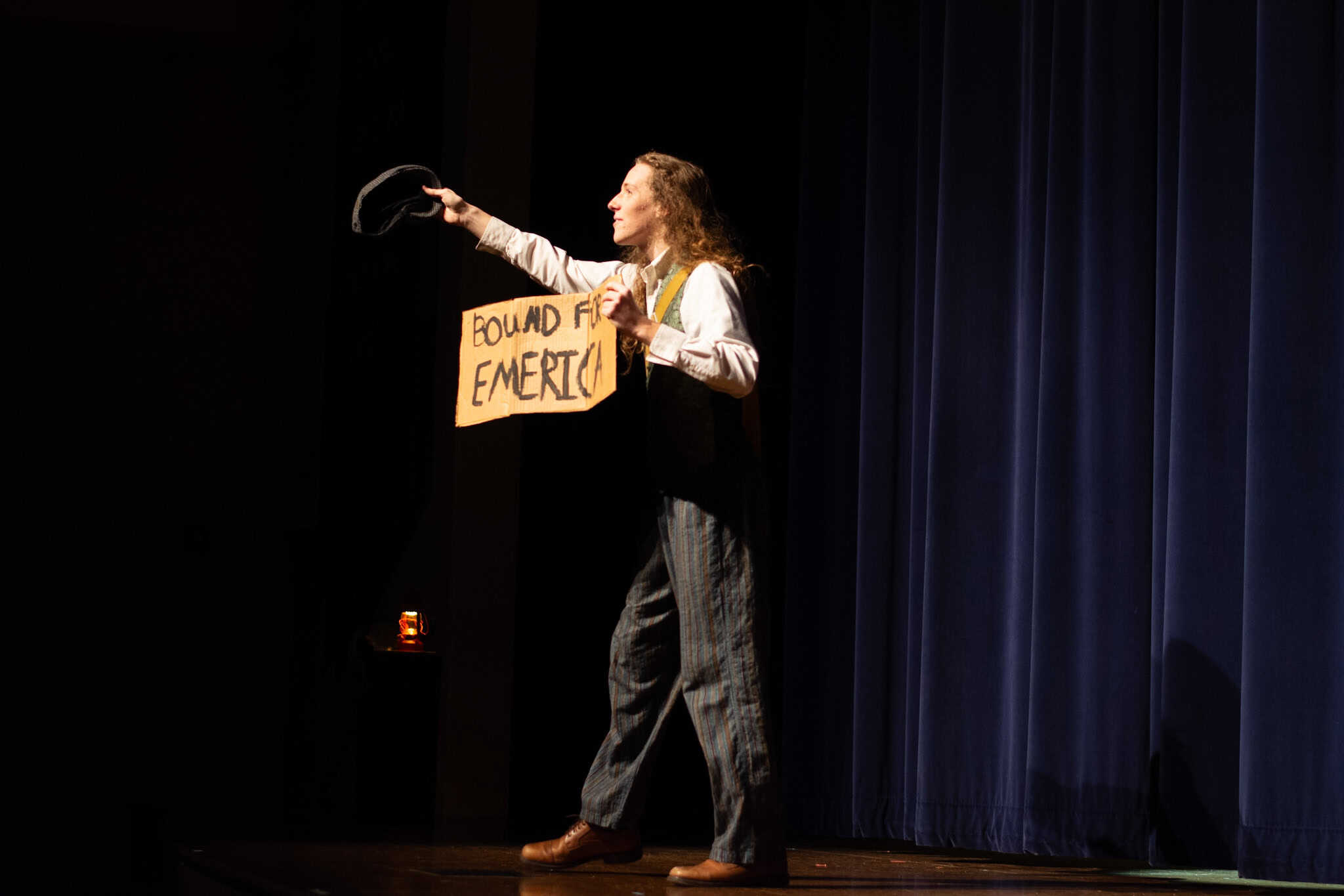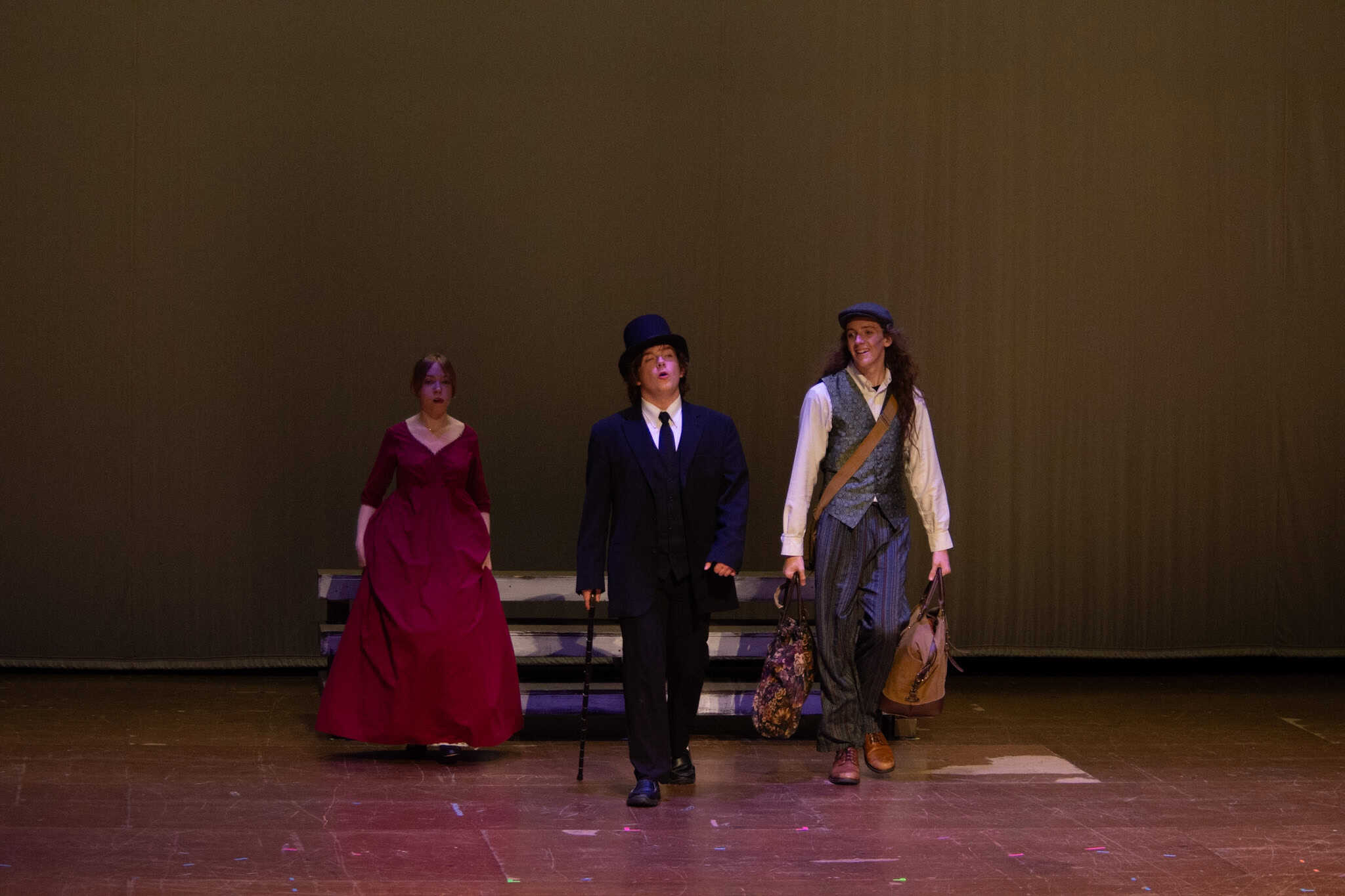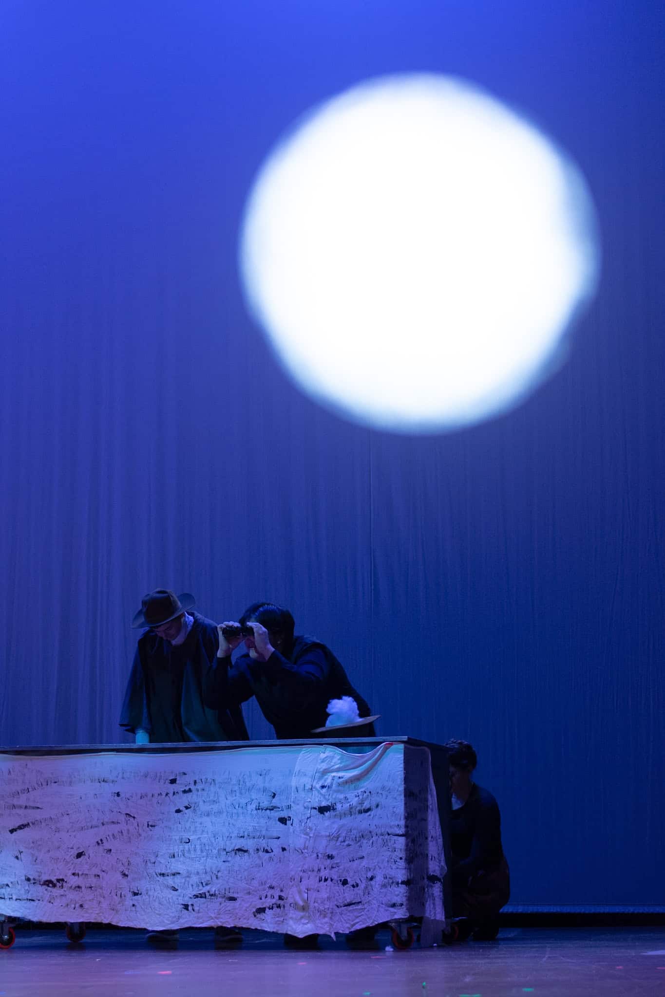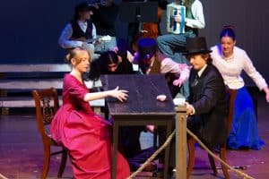“One favorite moment was blocking the bandit scene in act two when Passepartout gets kidnapped. It’s such an absurd moment. There’s a fake horse, masks, cowboy hats, and the bandits names are John, Johnson, Son, and I believe Johnsonson. To make sure we had it and nobody would accidentally got elbowed, we ran it in slow motion with everyone hilariously falling to ground and exclaiming ‘Johnson!!!’ at a turtle’s pace. It’s been so fun working with the students and Liz to allow the students to find those moments of absurdity and fun choices whether we end up doing them in the show or not.” – Elizabeth Eby, co-director