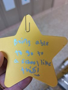 In chapel on Monday, students, staff, and faculty did just this, they shared their gratitude for the large and small things they are thankful for. Examples of those expressions of gratitude include, “my brother, being able to go to a school like this, my mom.” Those stars now line our halls and as we enter into the advent season. They will serve as reminders of who we are together and what we value.