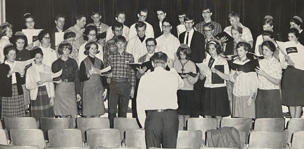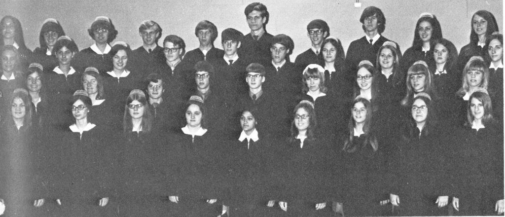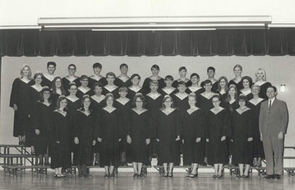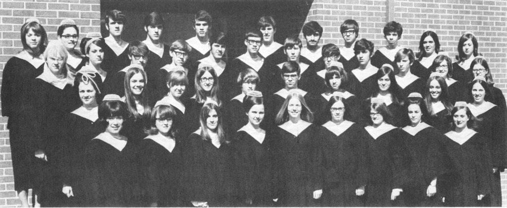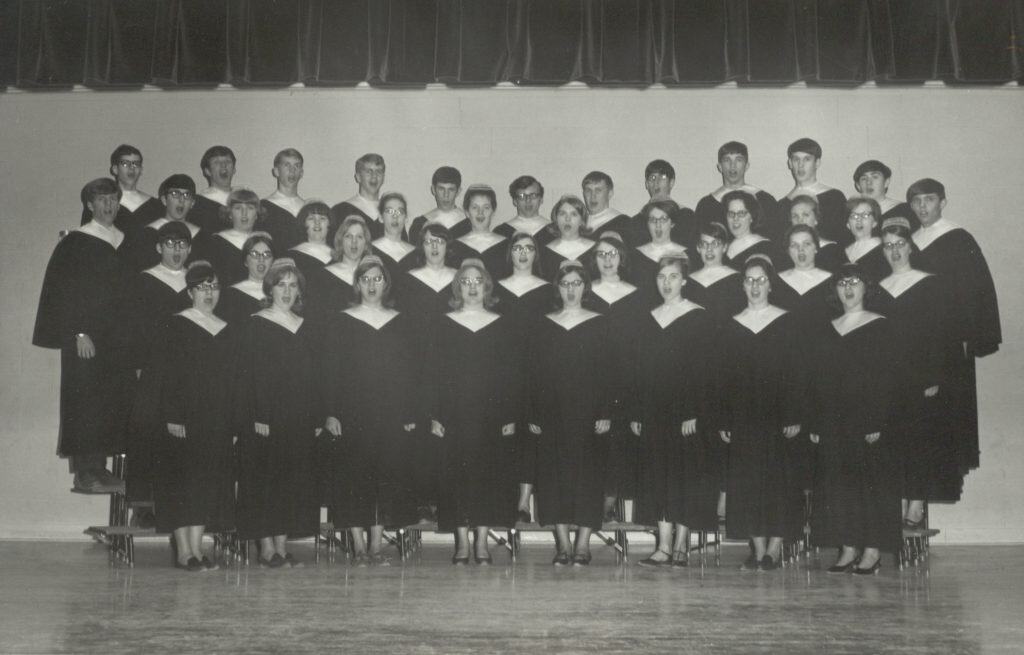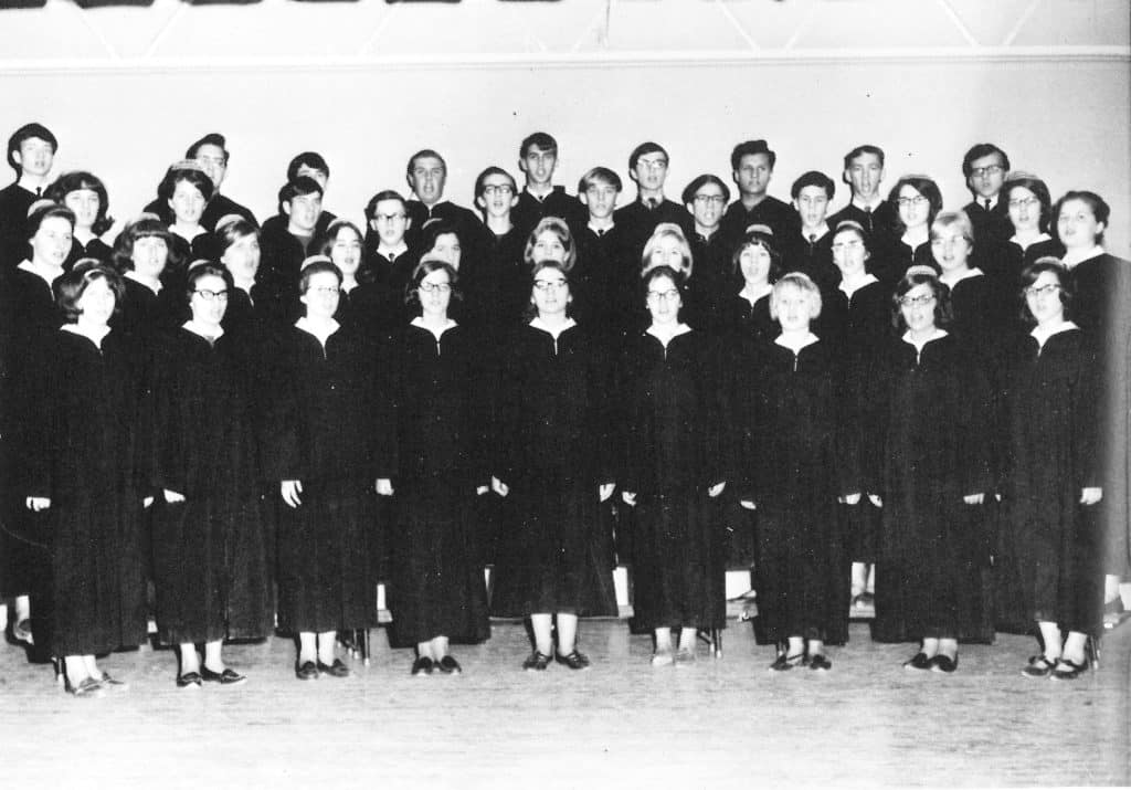 1965-66: Reuben Yoder is head of the music department. Touring Chorus performs in Pennsylvania, Ohio, Indiana, and Michigan en route to and from the Mennonite High School Music Festival at Goshen (Indiana) College. Use of instrumental music to accompany singing and the commencement processional and recessional is approved.
