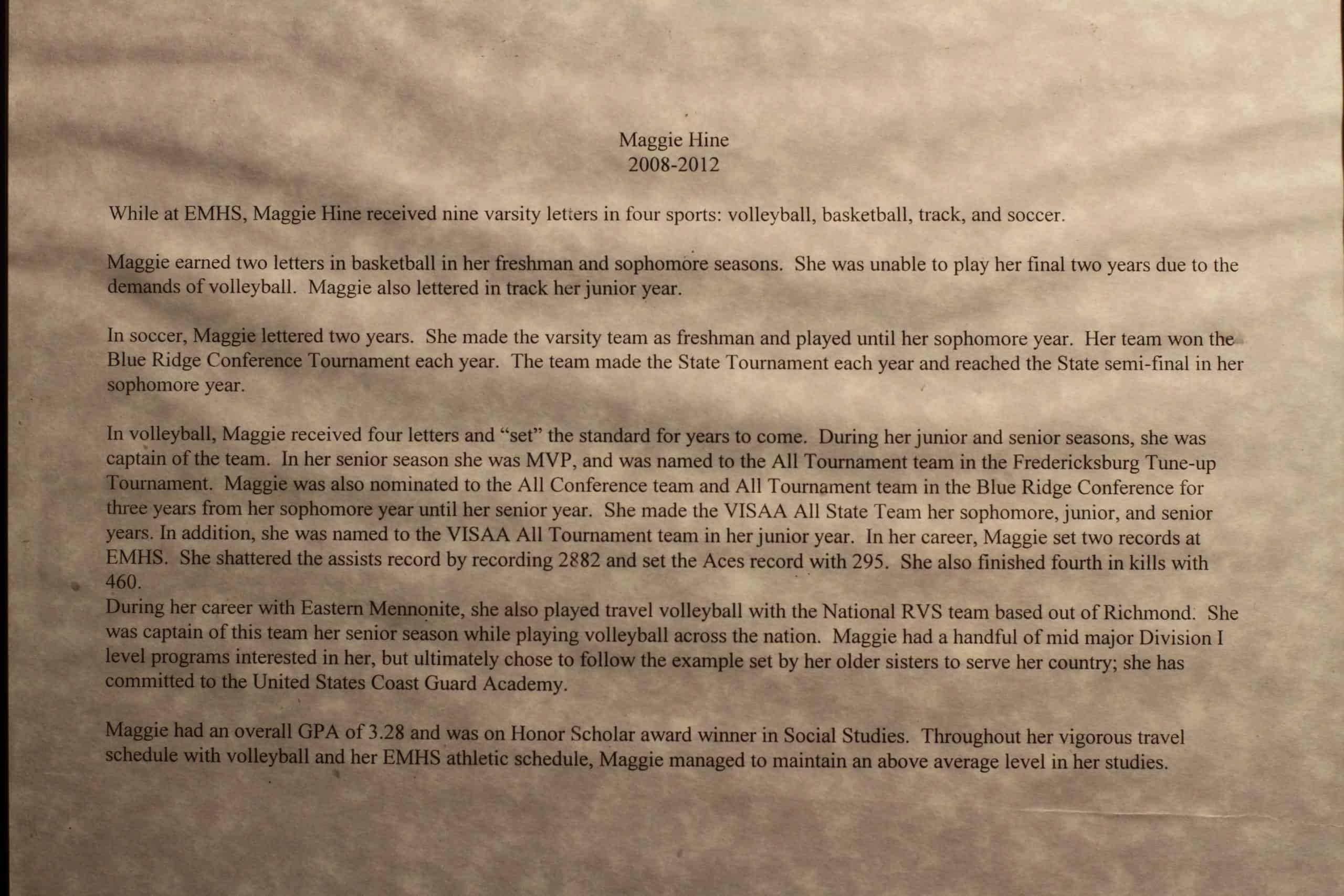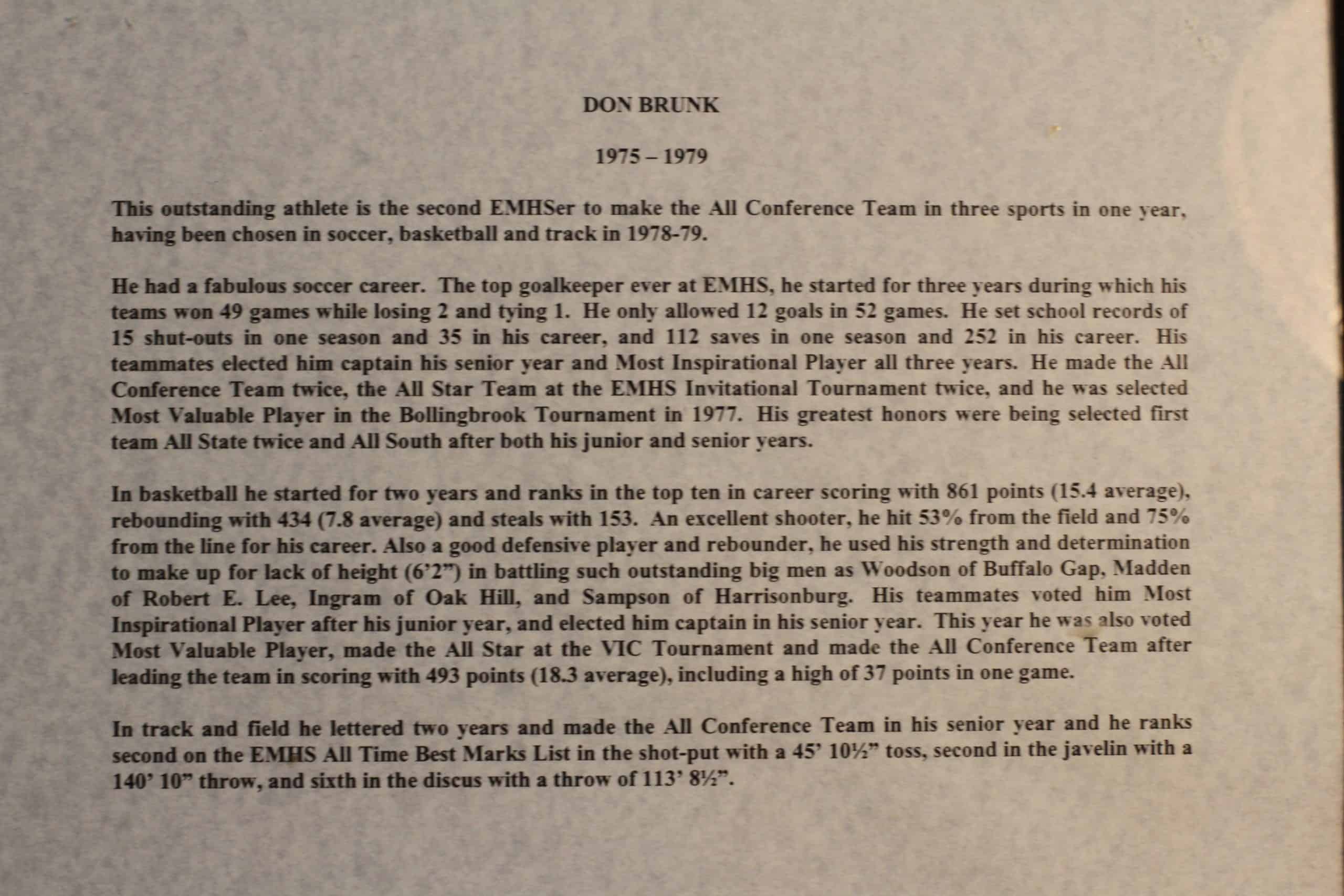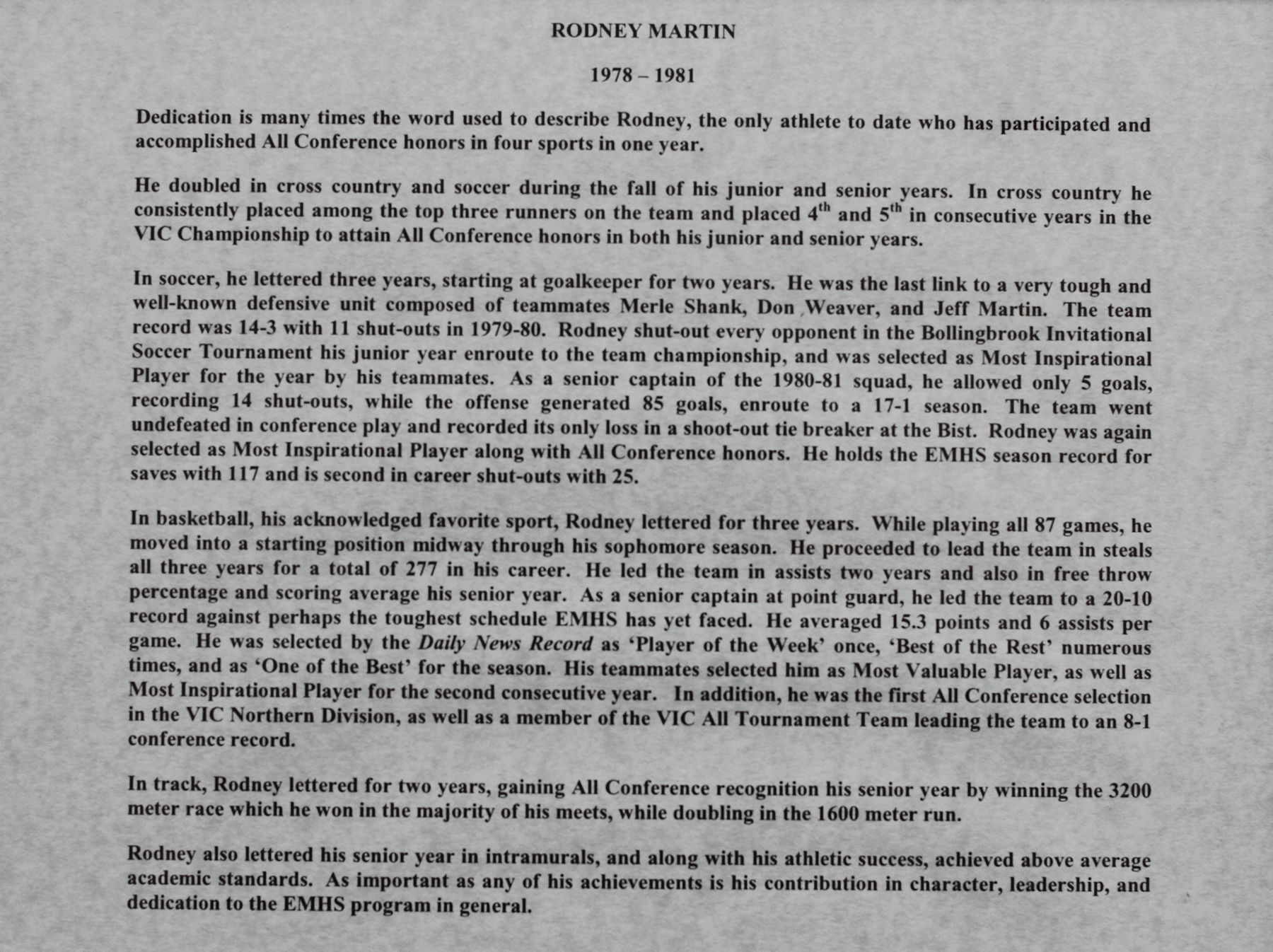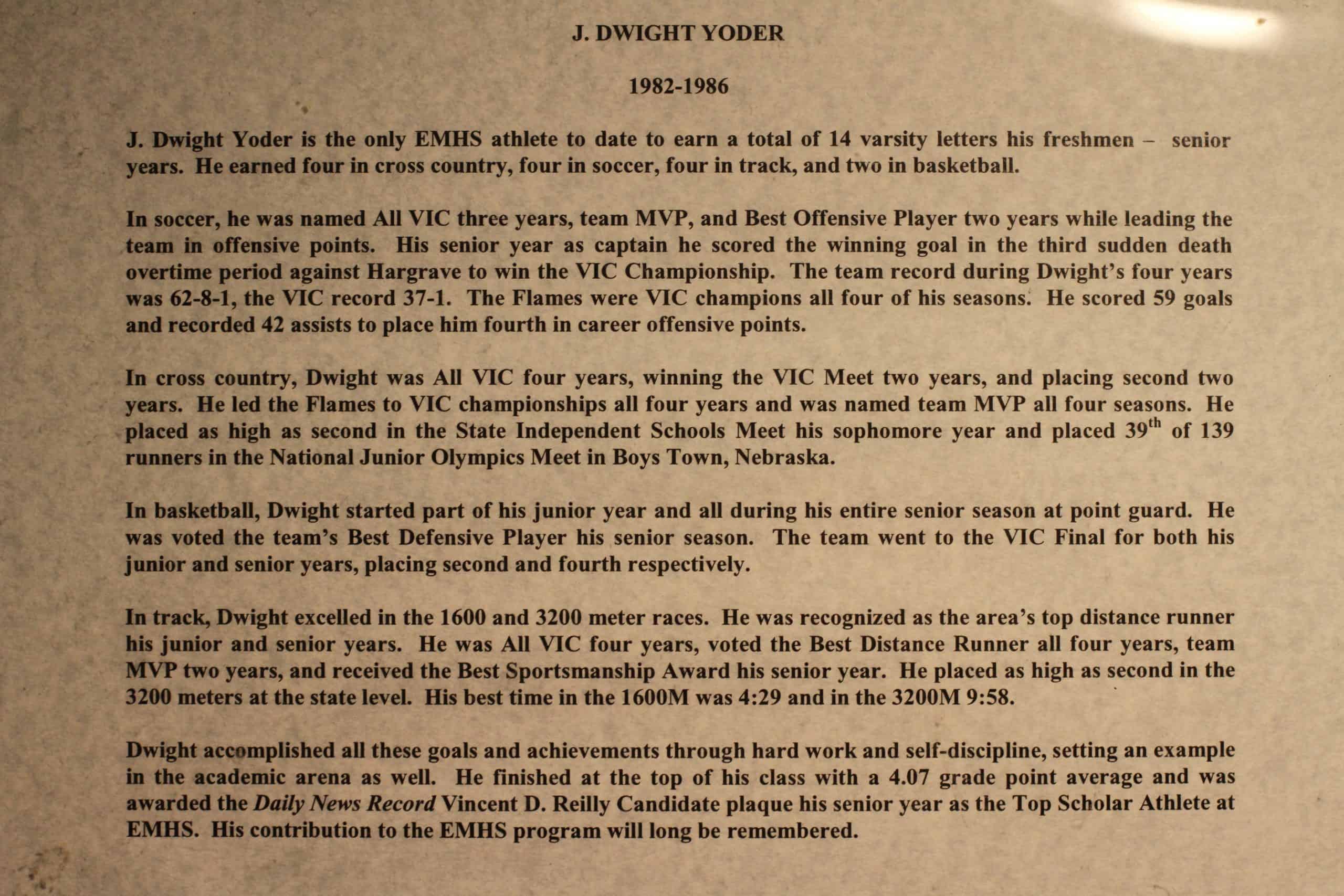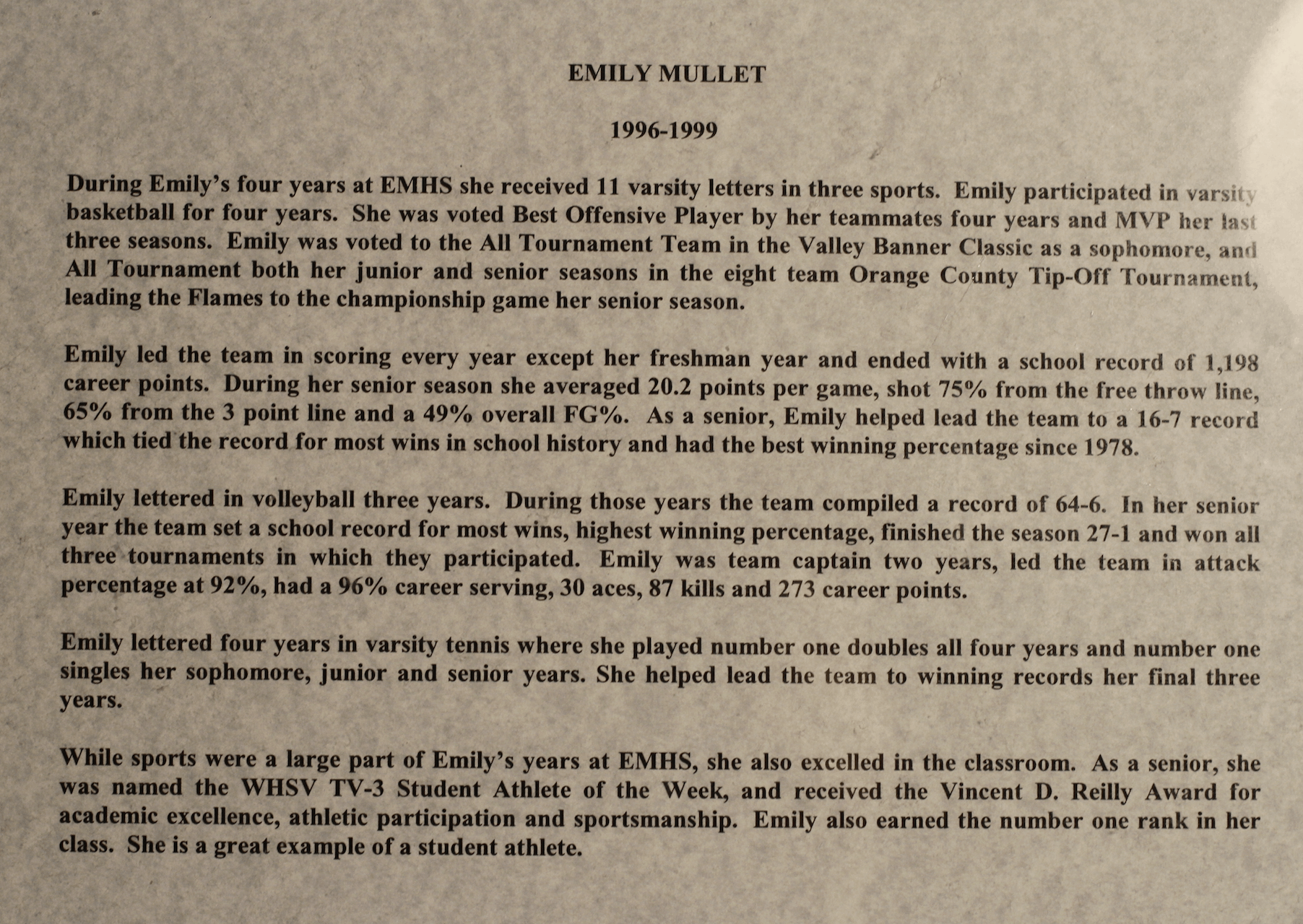 In the mid 1970s, EMS began to recognize outstanding EMHS student-athletes for their athletic and academic accomplishments by adding them to the the Athletic Hall of Honor, located outside the entrance to the gym from the school building.