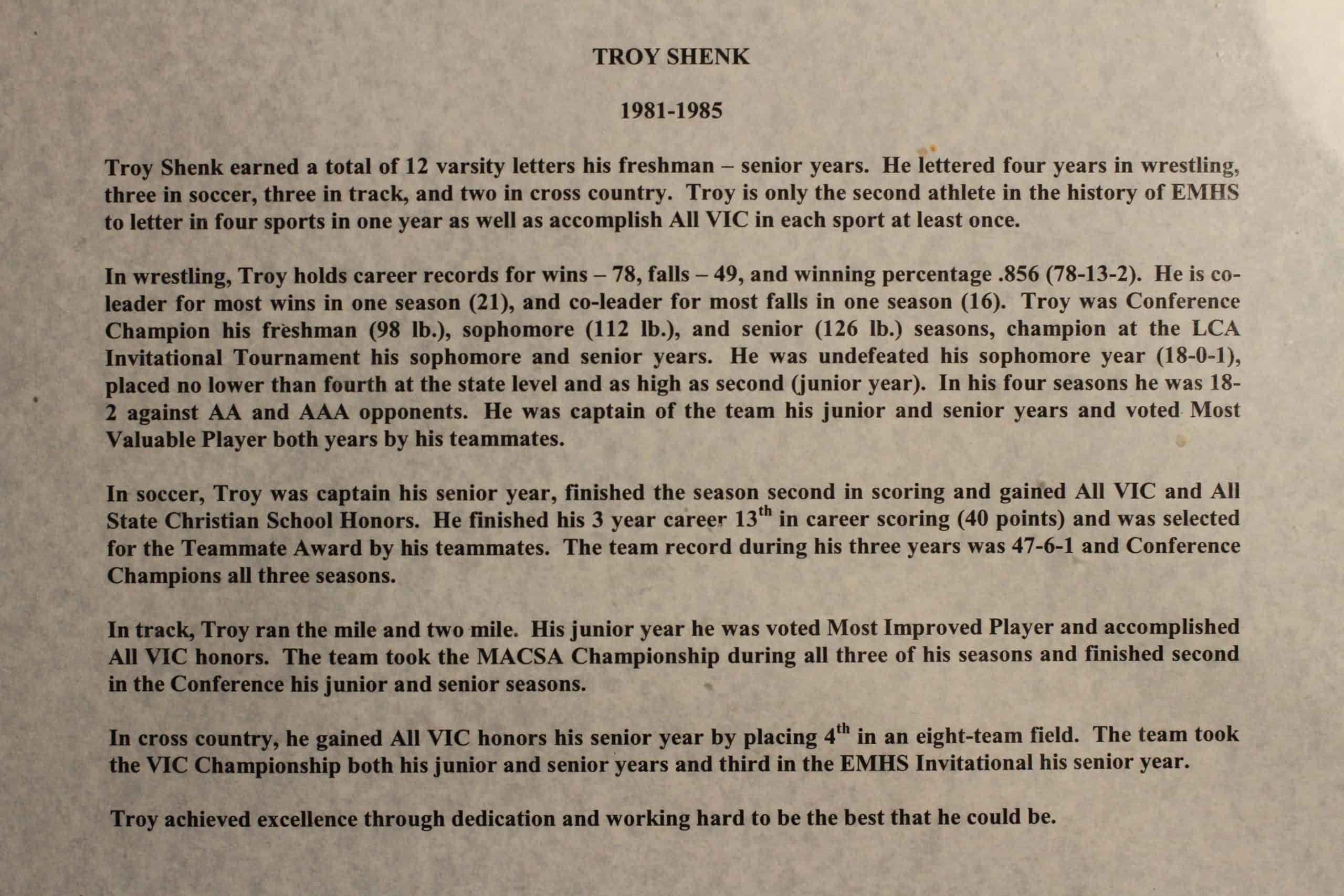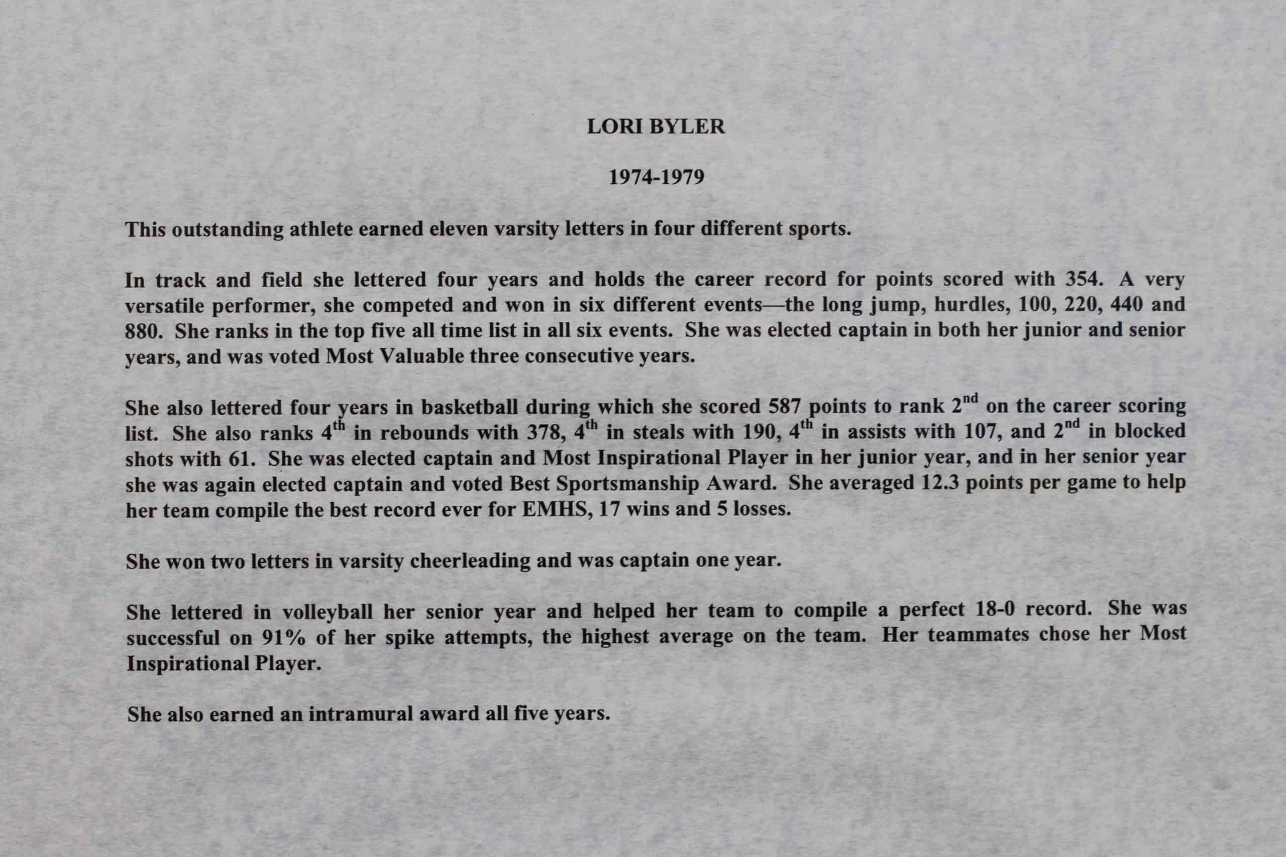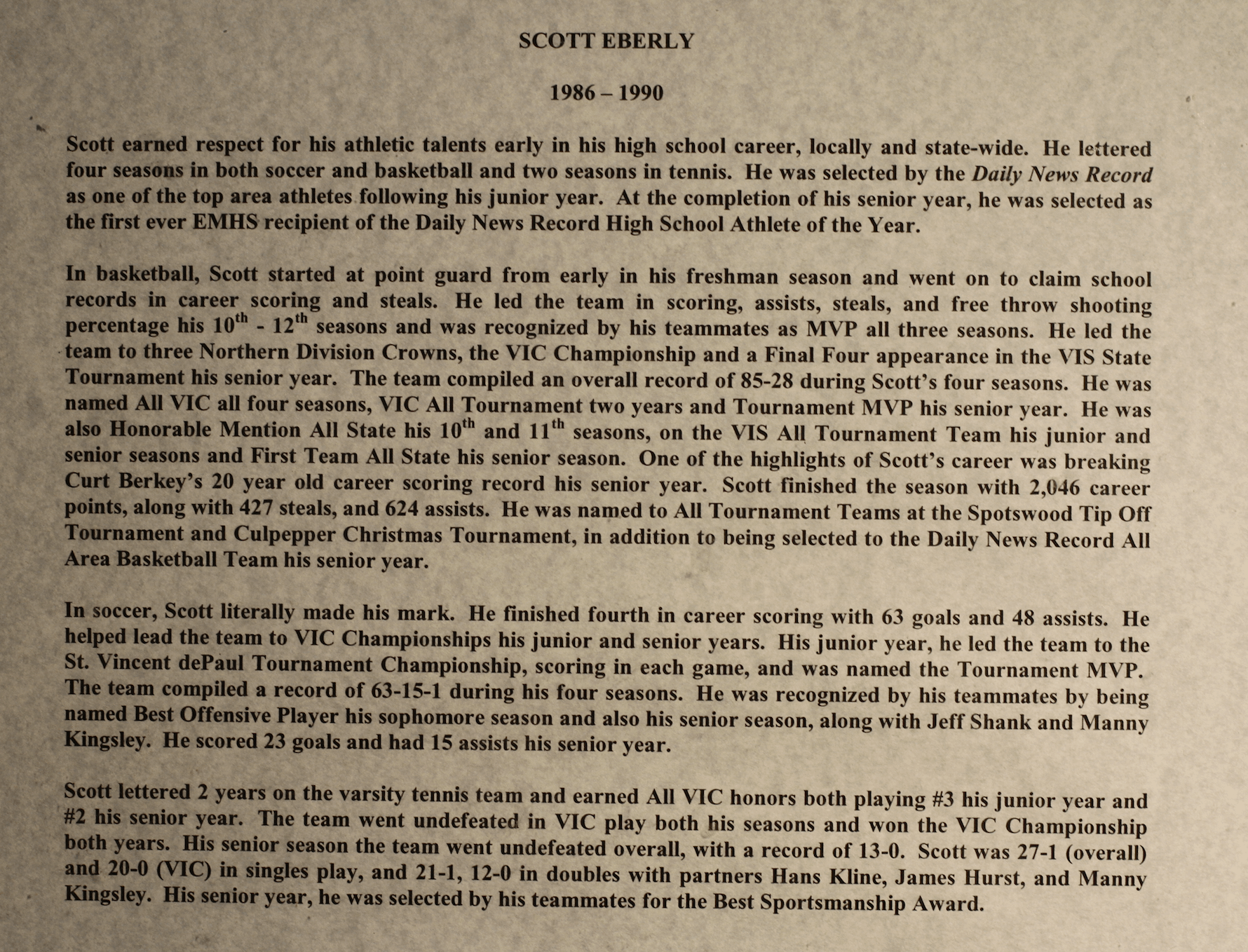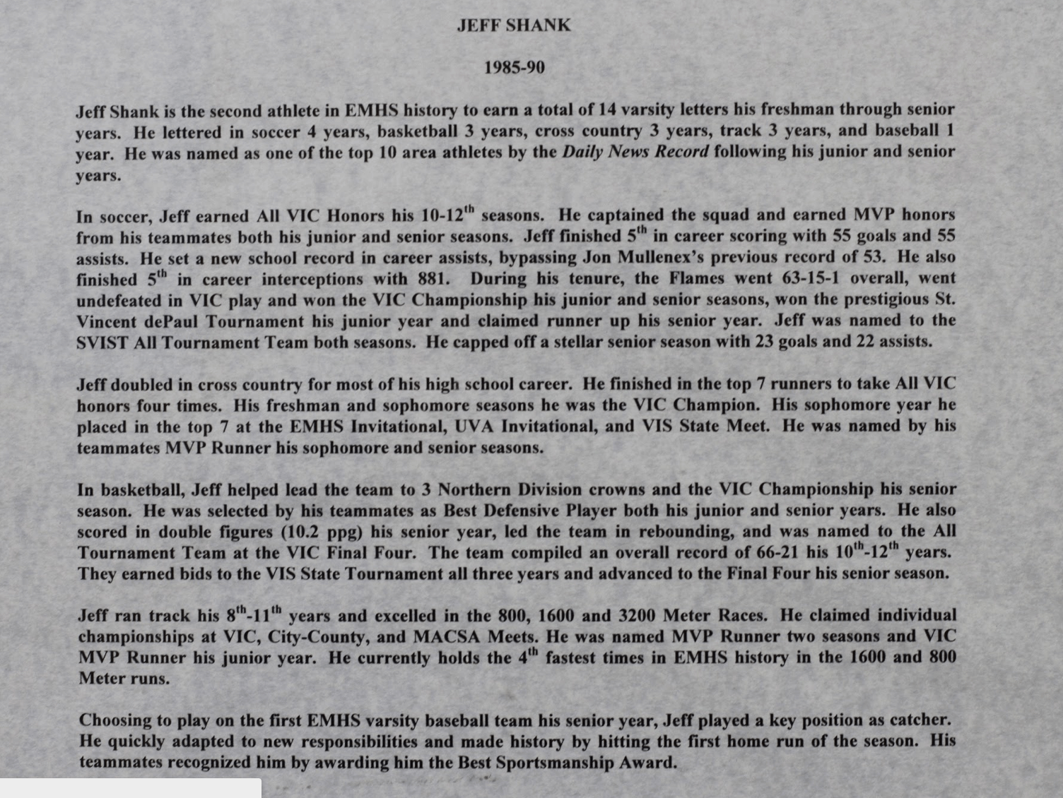 In the mid 1970s, EMS began to recognize outstanding EMHS student-athletes for their athletic and academic accomplishments by adding them to the the Athletic Hall of Honor, located outside the entrance to the gym from the school building.
