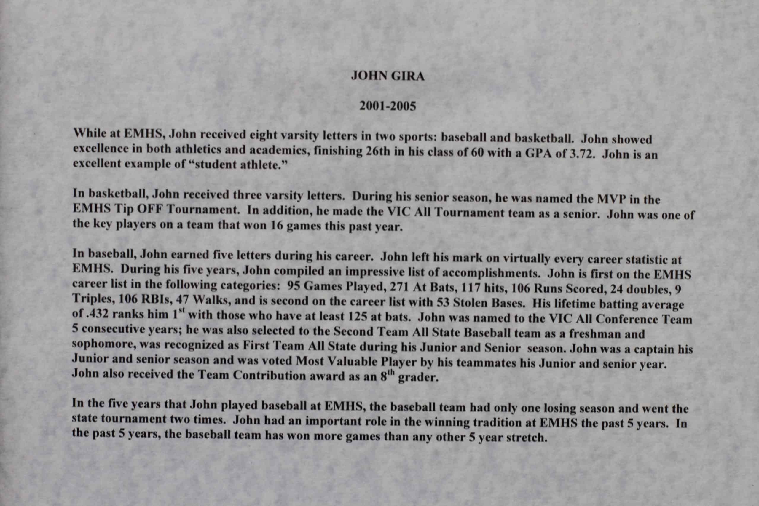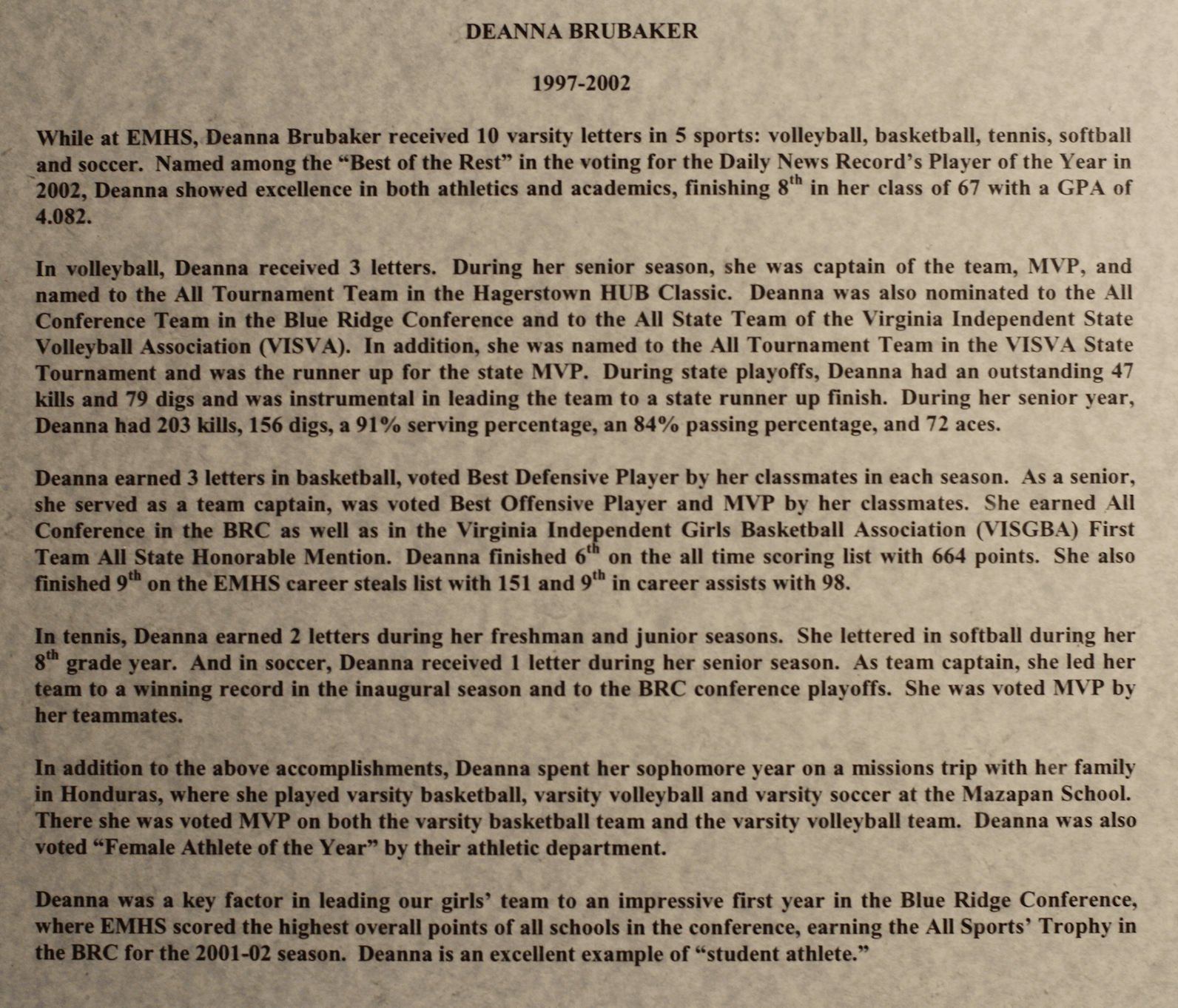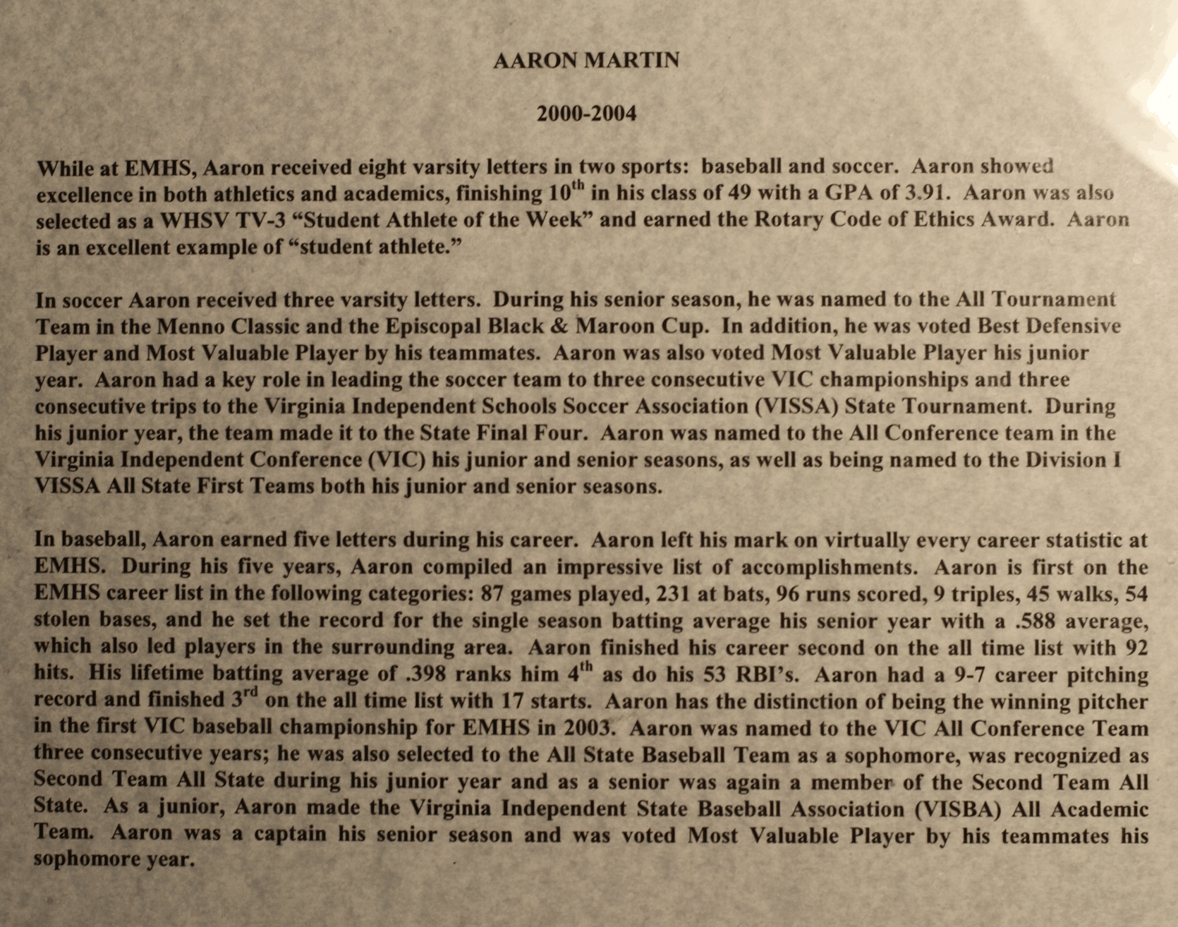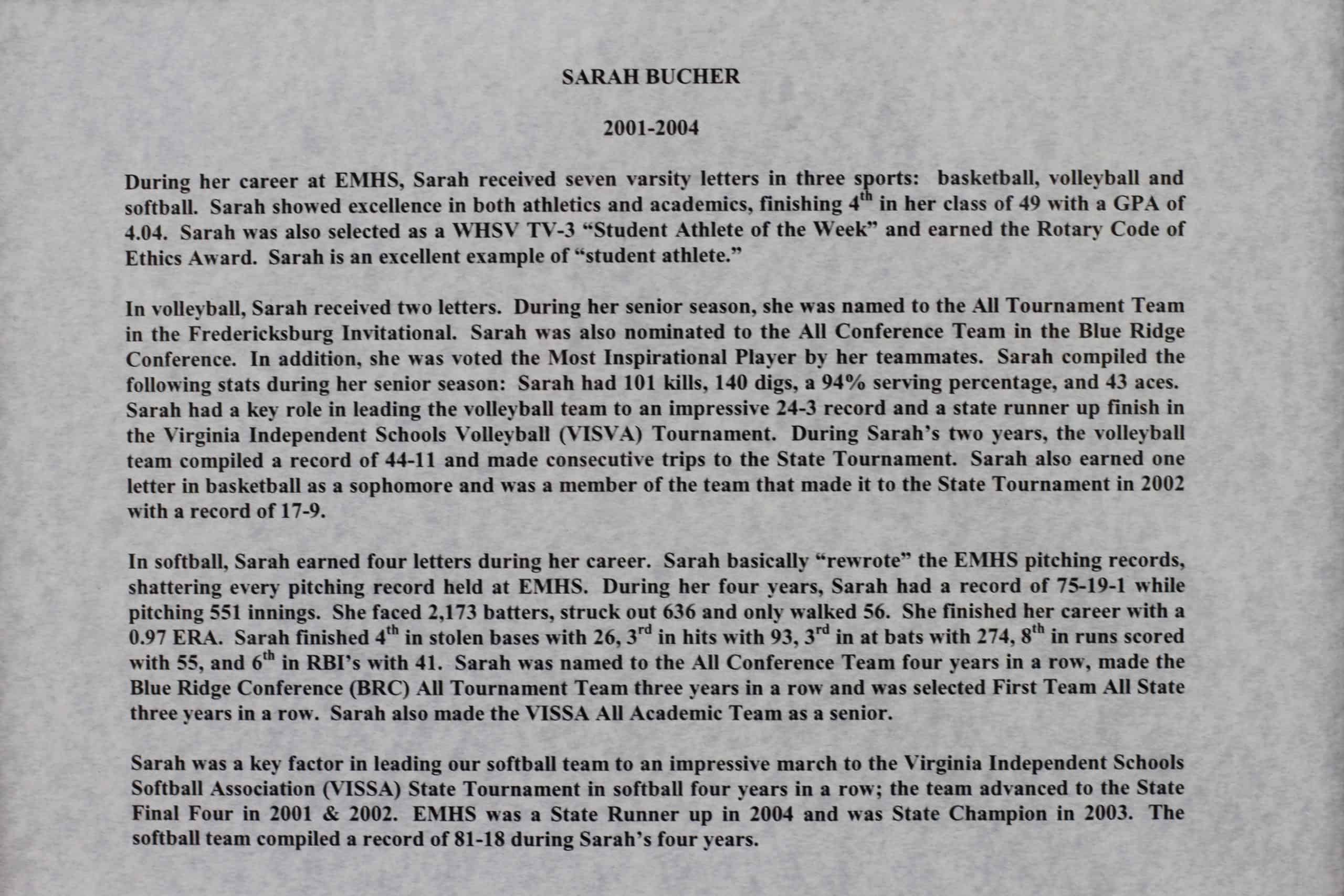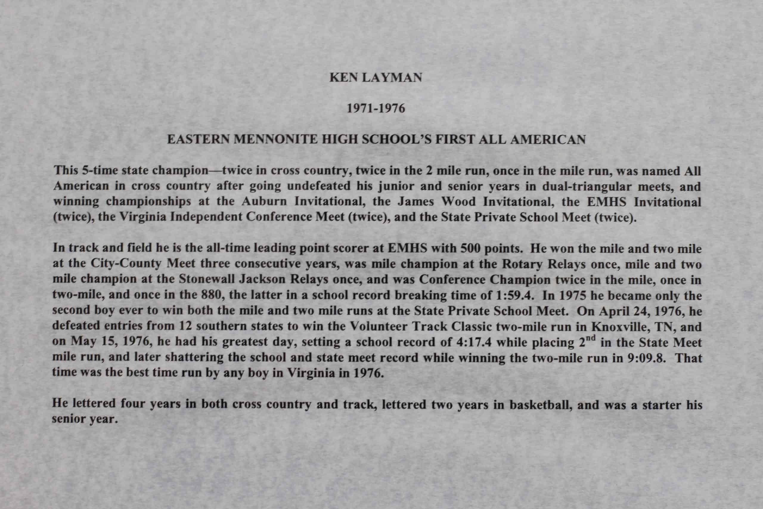 In the mid 1970s, EMS began to recognize outstanding EMHS student-athletes for their athletic and academic accomplishments by adding them to the the Athletic Hall of Honor, located outside the entrance to the gym from the school building.
