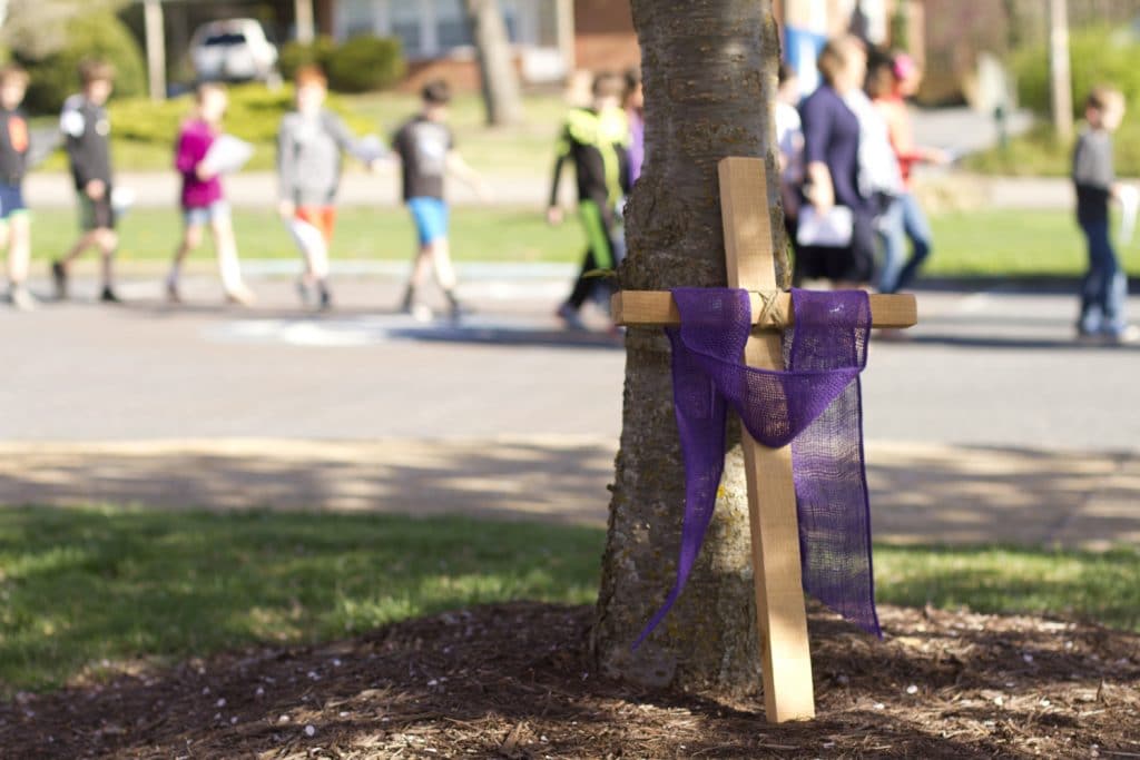 On April 10, our elementary students listened to and reflected on the Easter story. Stations displayed symbols of Passion Week, and students walked as a group from station to station in what is called a Passion Walk. Fifth graders read scripture passages, the group sang songs at each station, and fourth graders led the procession…