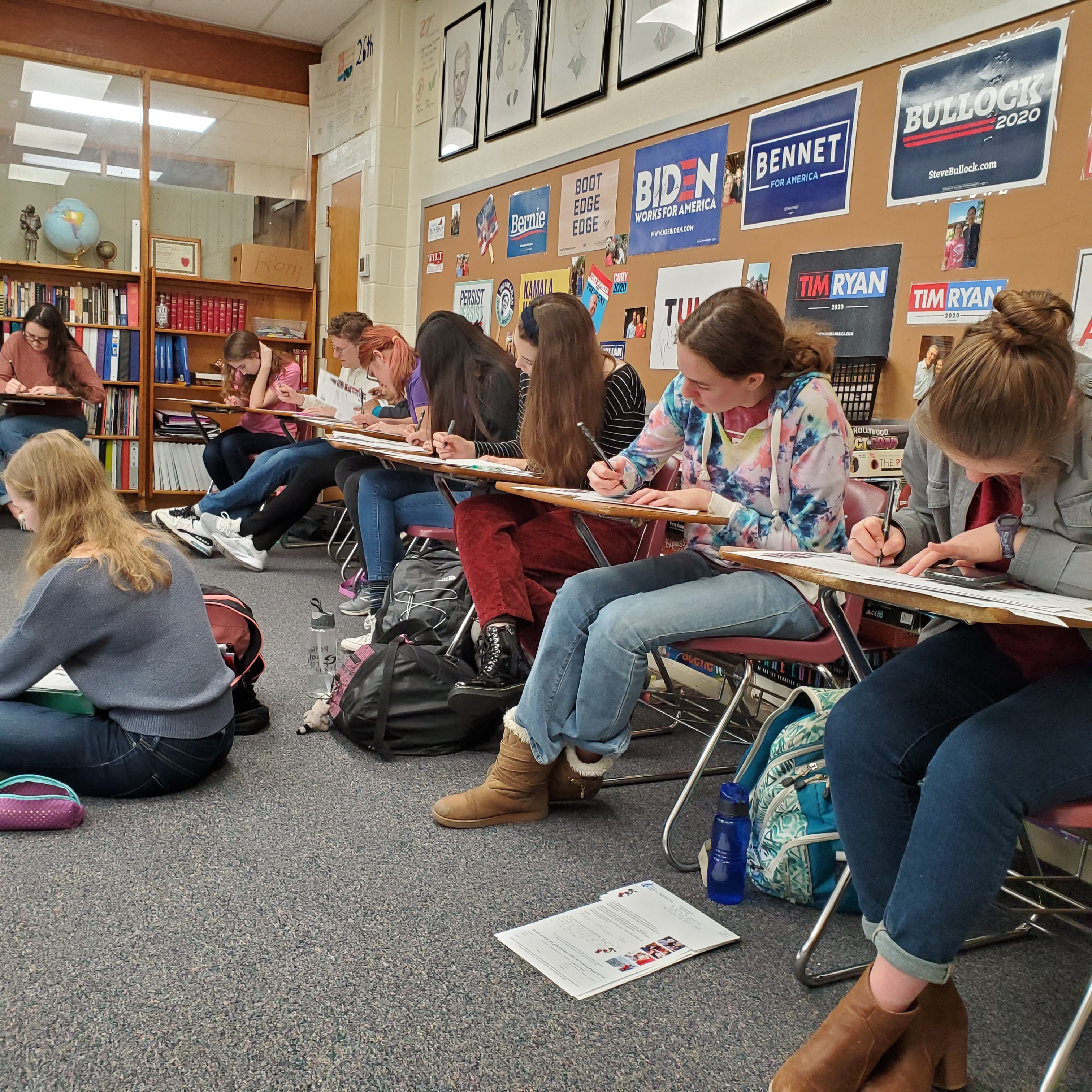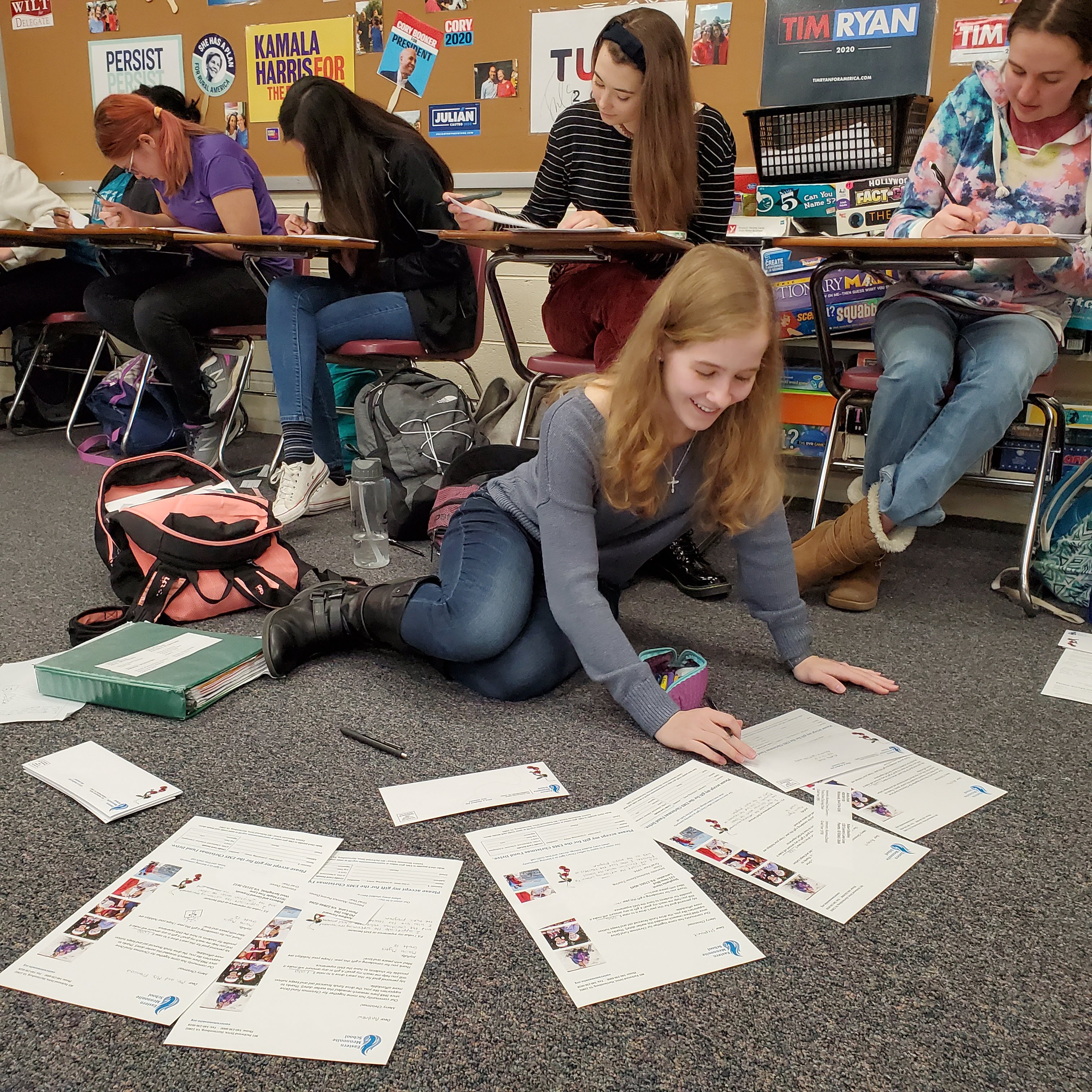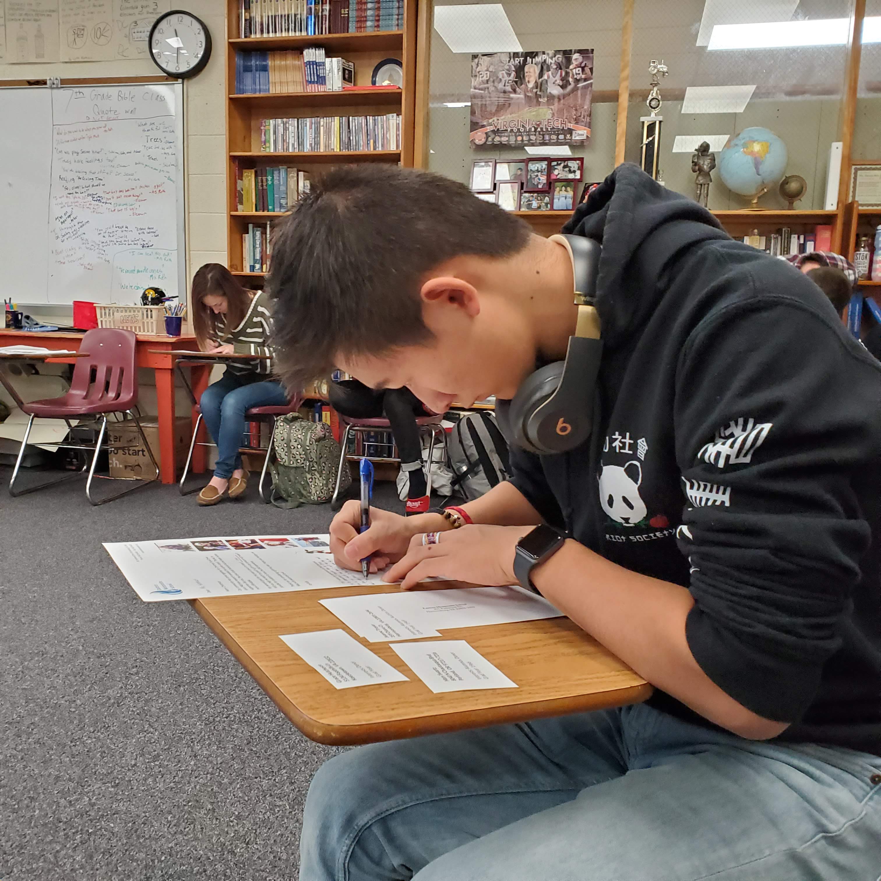 For the first time in memory, the senior class has 100 percent participation in the Christmas Fund Drive. Shannon Roth, government teacher, wove letter writing into a government lesson on civic engagement, spurring much of the energy. Learning to write to constituents and express opinions and passions is a key way to engage in our government, she noted. Students and Mrs. Roth wrote letters during a class period as they reviewed the how-tos of letter writing and advocacy for a cause.