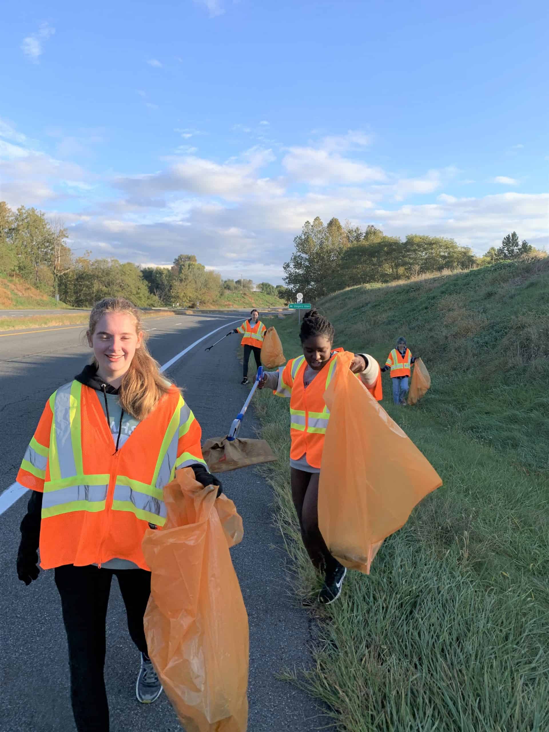 Nearly 20 students donned safety vests and gloves on a recent Saturday morning to join Rotary of Rockingham County efforts to serve the community through highway clean up.