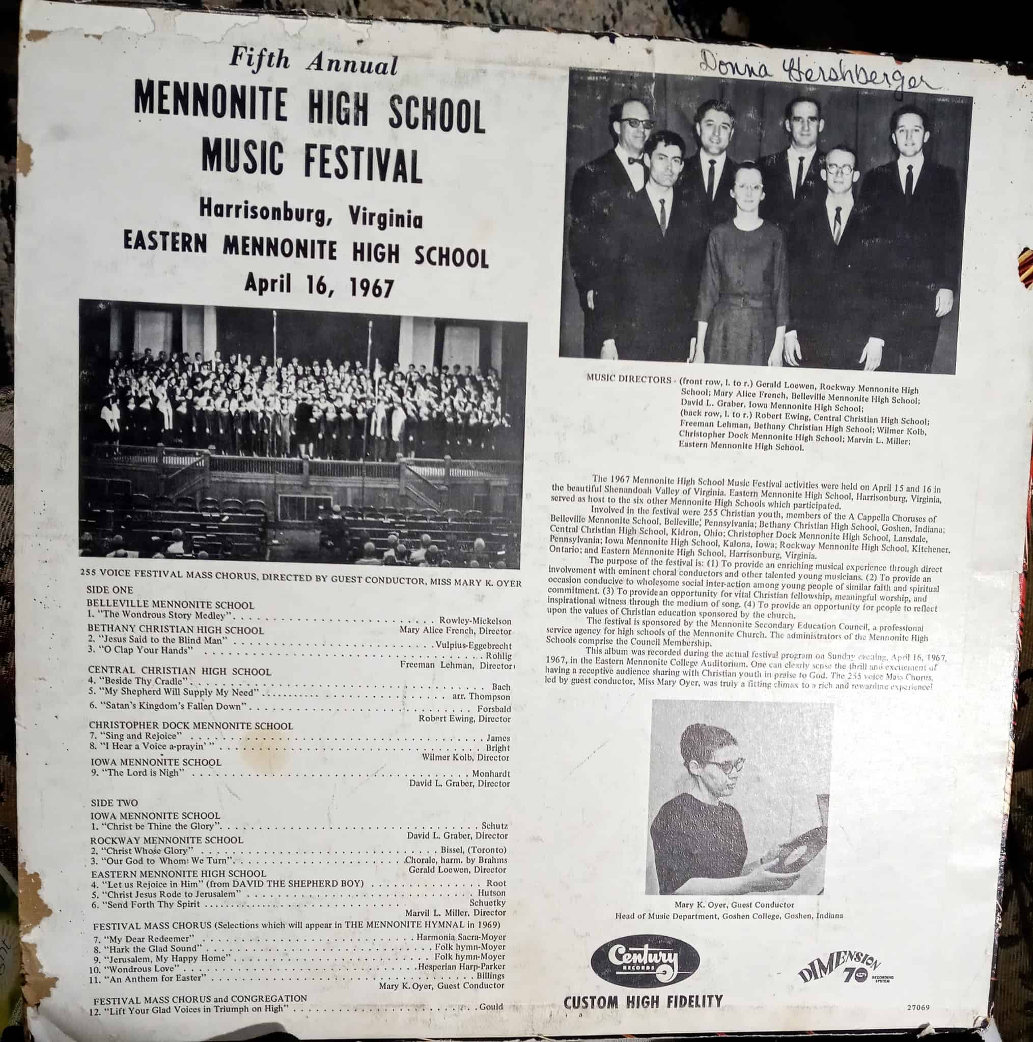 Hice una gira con el coro de IMS (también conocido como Hillcrest Academy) en mi último año en mayo de 1967. El festival de ese año fue en EMC (también conocido como EMU), en Harrisonburg, VA, pero no estoy seguro de cuántos festivales se habían celebrado antes. . Participaron siete escuelas, incluida Rockway de Kitchener, Ontario. Fue mi primera visita a la zona y fue buena: ¡grandes recuerdos! ¡Ya llevo 48 años viviendo en el Valle! Asistí a la presentación de 2018 en Yoder Arena cuando participaron 13 escuelas, ¡y espero con ansias esta!