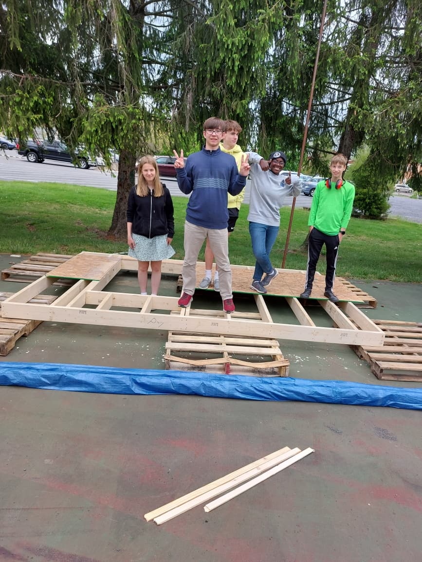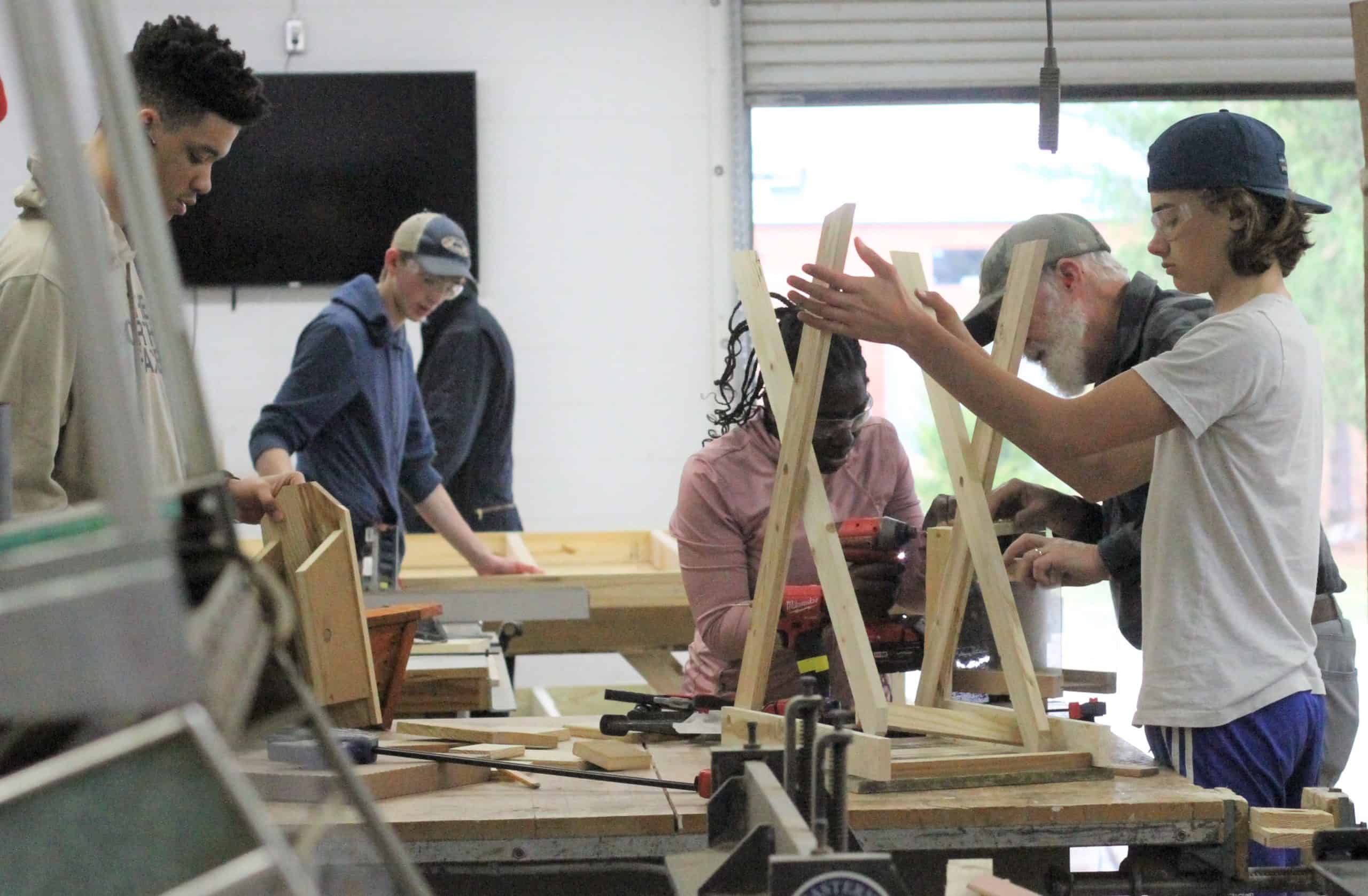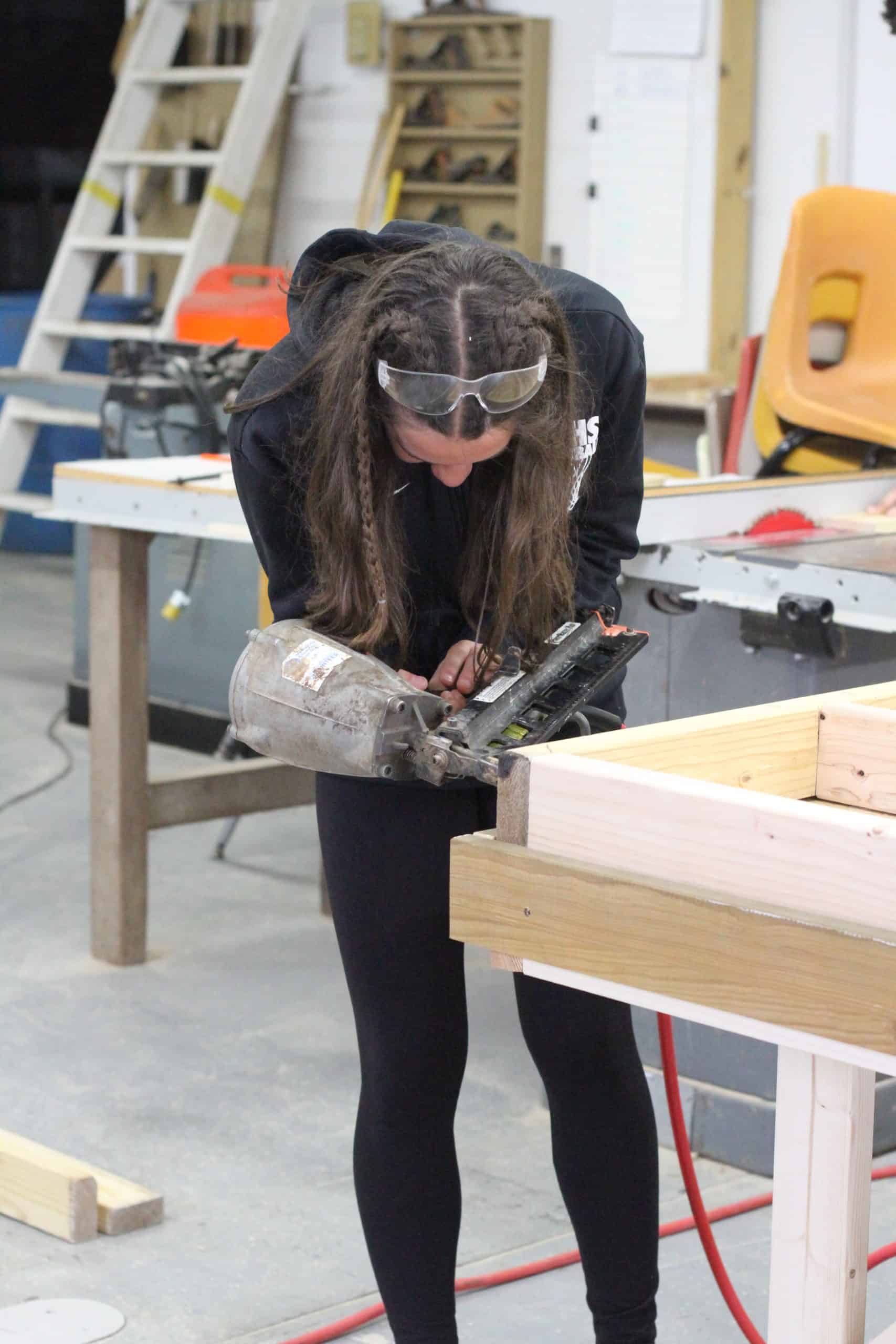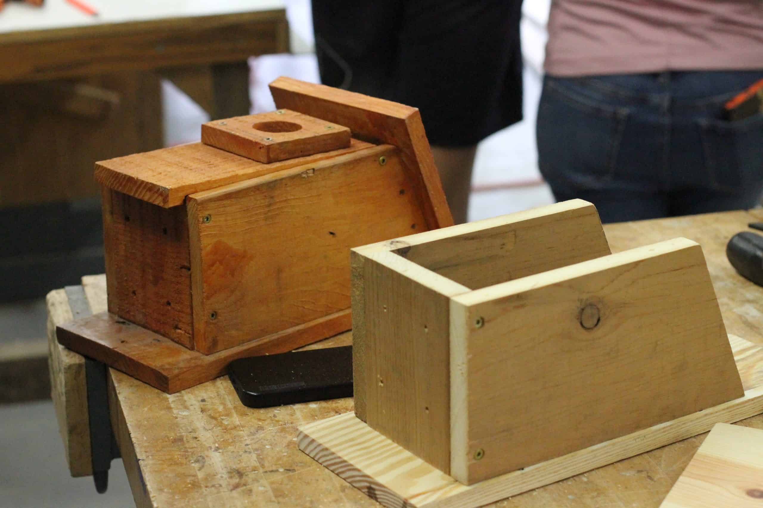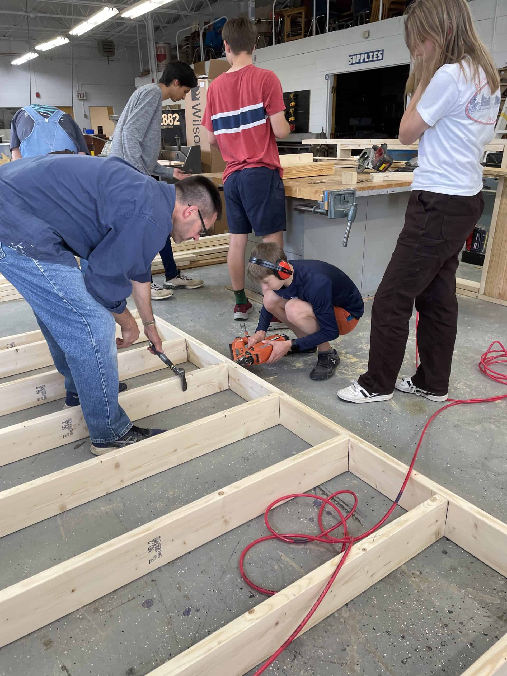 Before the students used nail guns and other power tools to construct the frames, they practiced measuring, sawing, hammering, and other skills on projects such as cutting boards, a birdhouse, a folding table, and building a shed on school grounds. The practice projects, except for the shed, were created using reclaimed pallets.