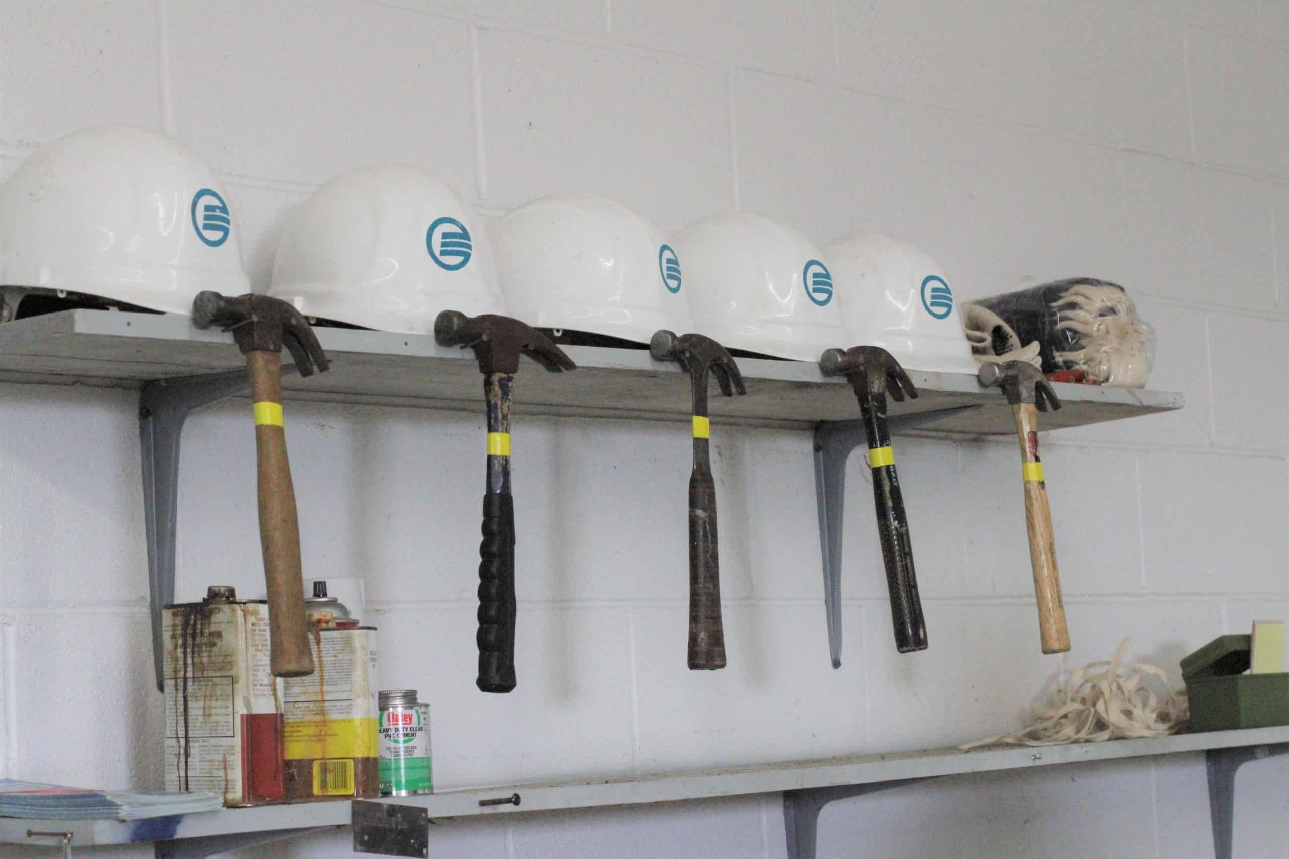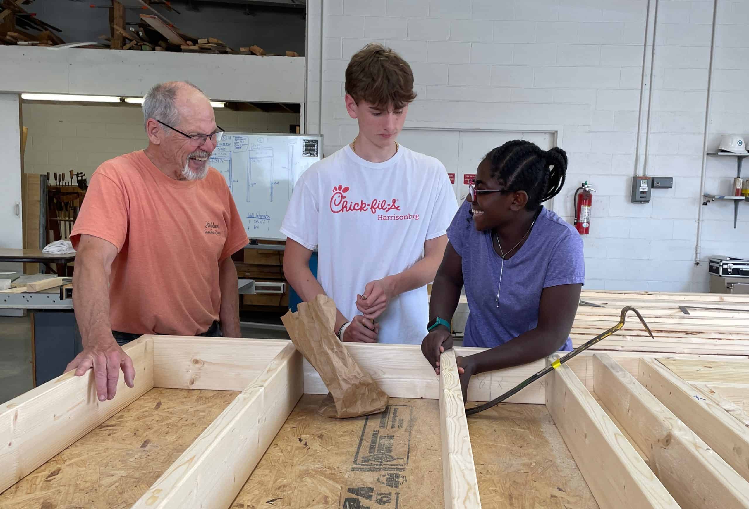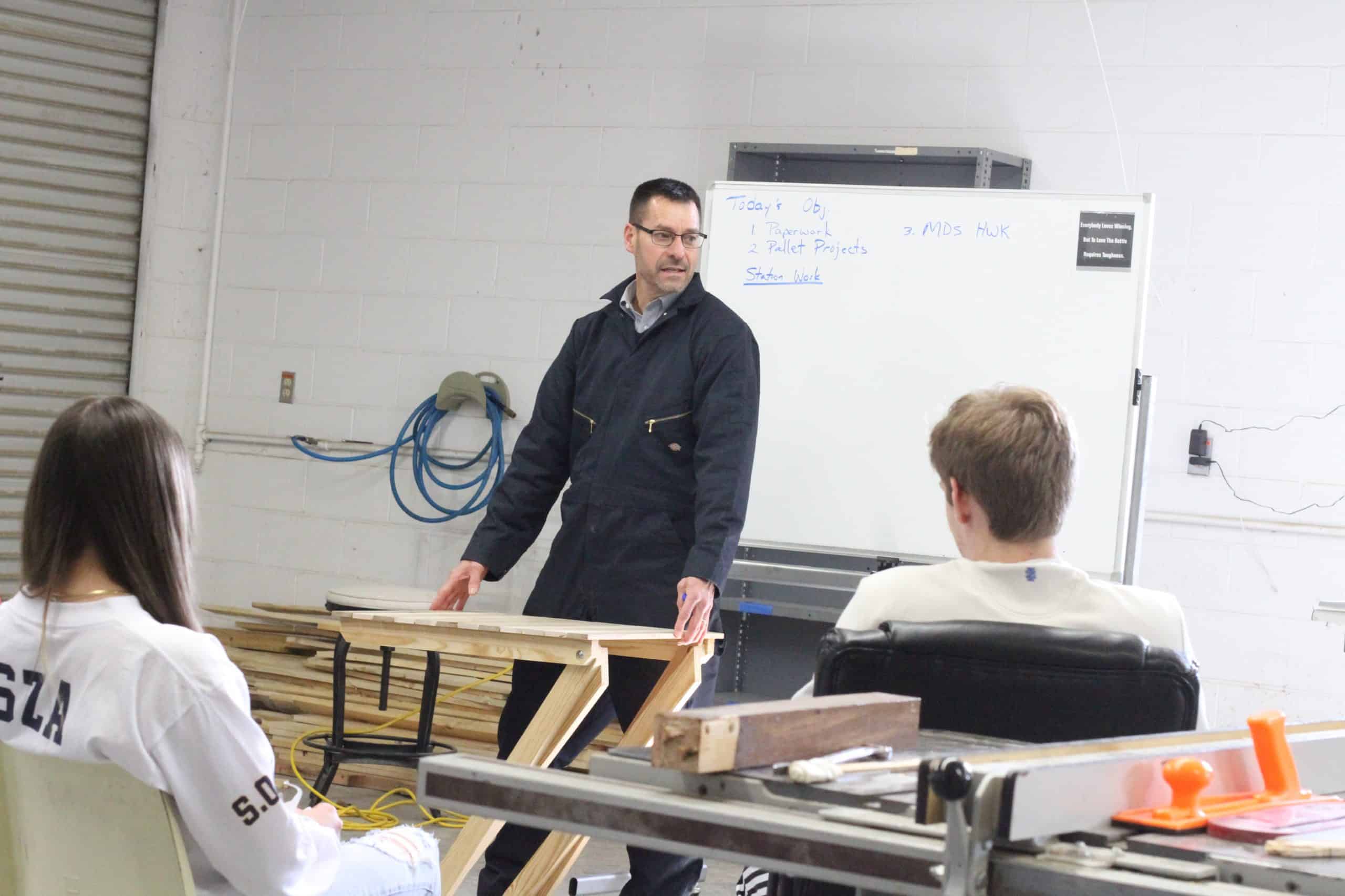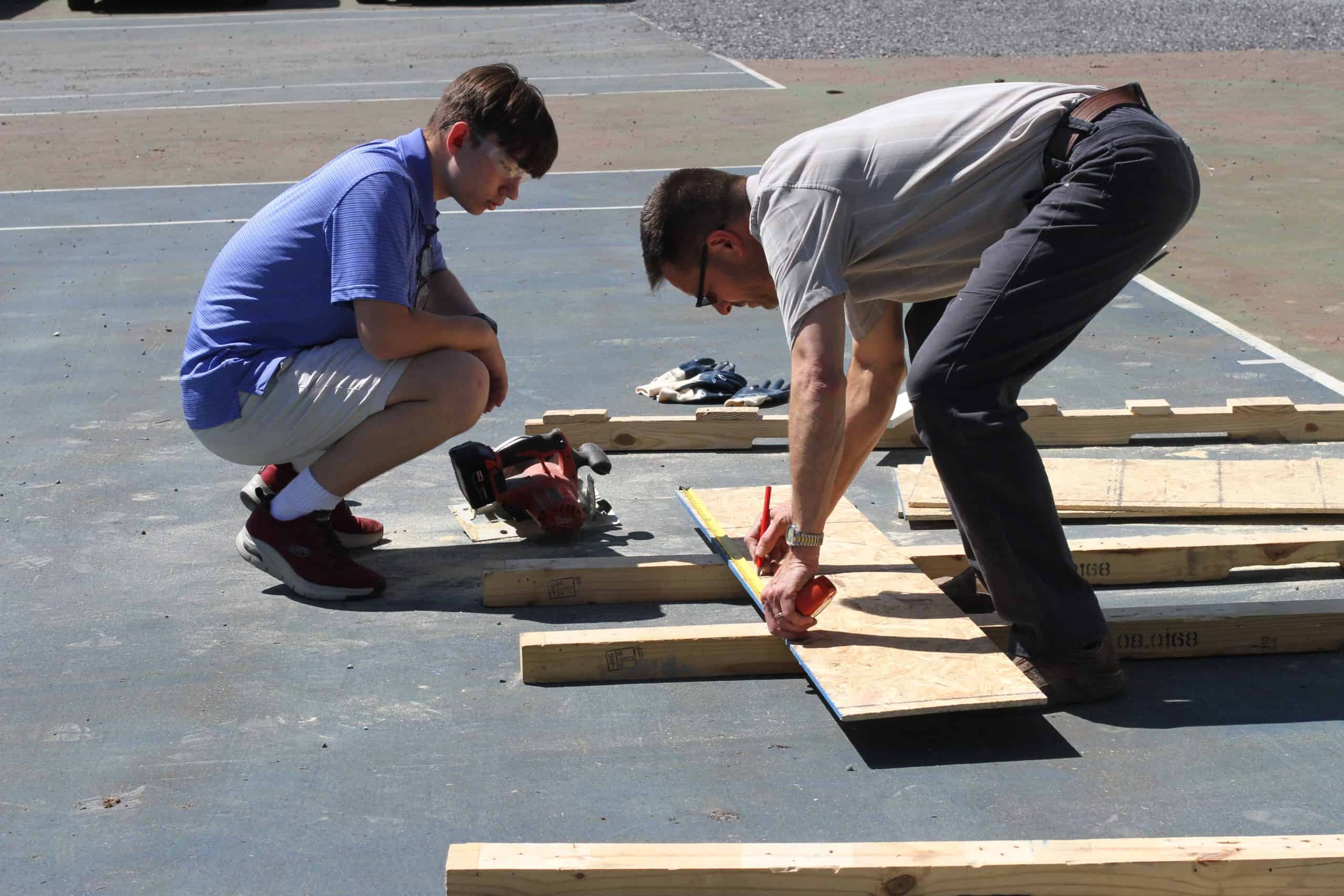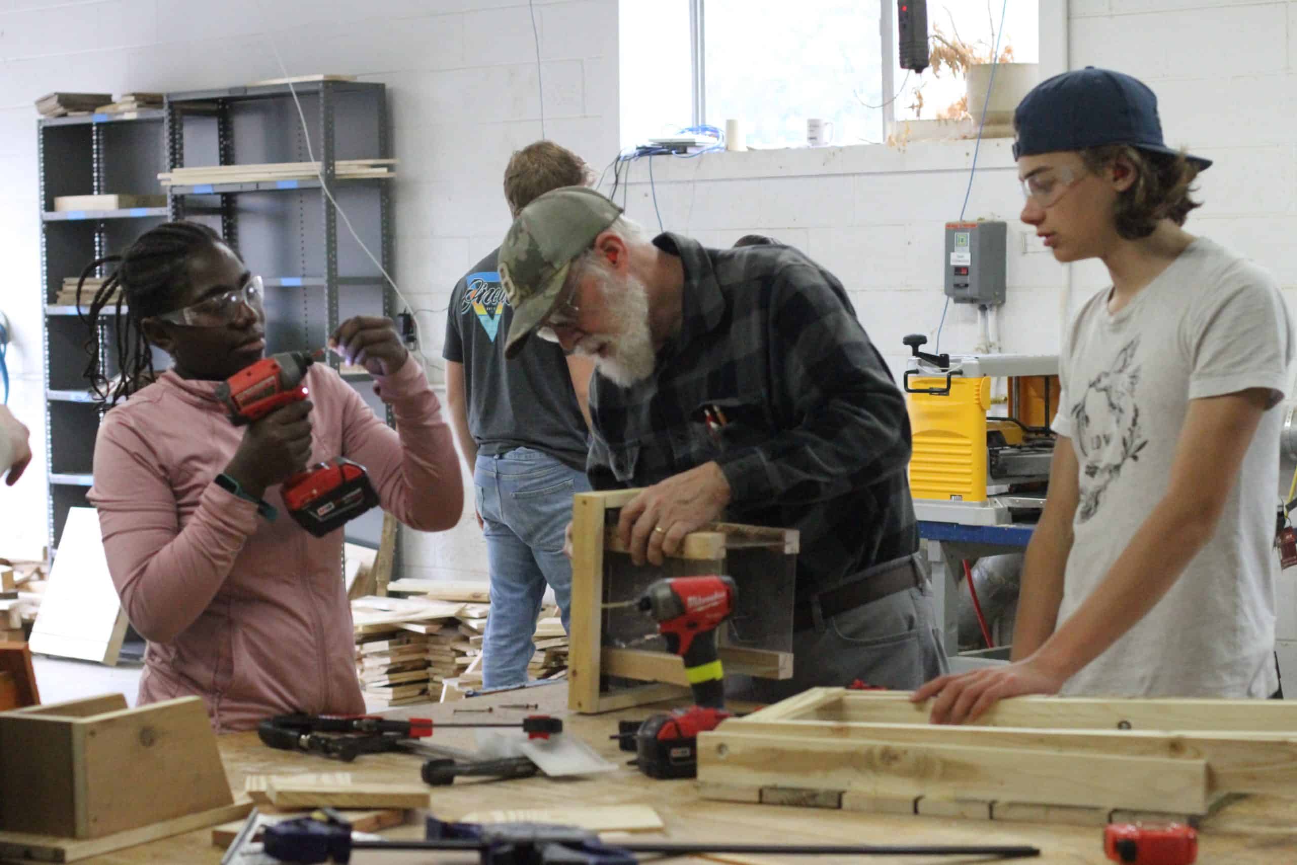 Before the students used nail guns and other power tools to construct the frames, they practiced measuring, sawing, hammering, and other skills on projects such as cutting boards, a birdhouse, a folding table, and building a shed on school grounds. The practice projects, except for the shed, were created using reclaimed pallets.