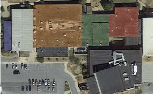 Las secciones coloreadas son partes más antiguas del techo que fueron reemplazadas. Sección azul: 2000 pies cuadrados. Sección naranja: 18,000 pies cuadrados. Sección verde: 7300 pies cuadrados. Sección roja: 7200 pies cuadrados. Total: 34,500 pies cuadrados.
